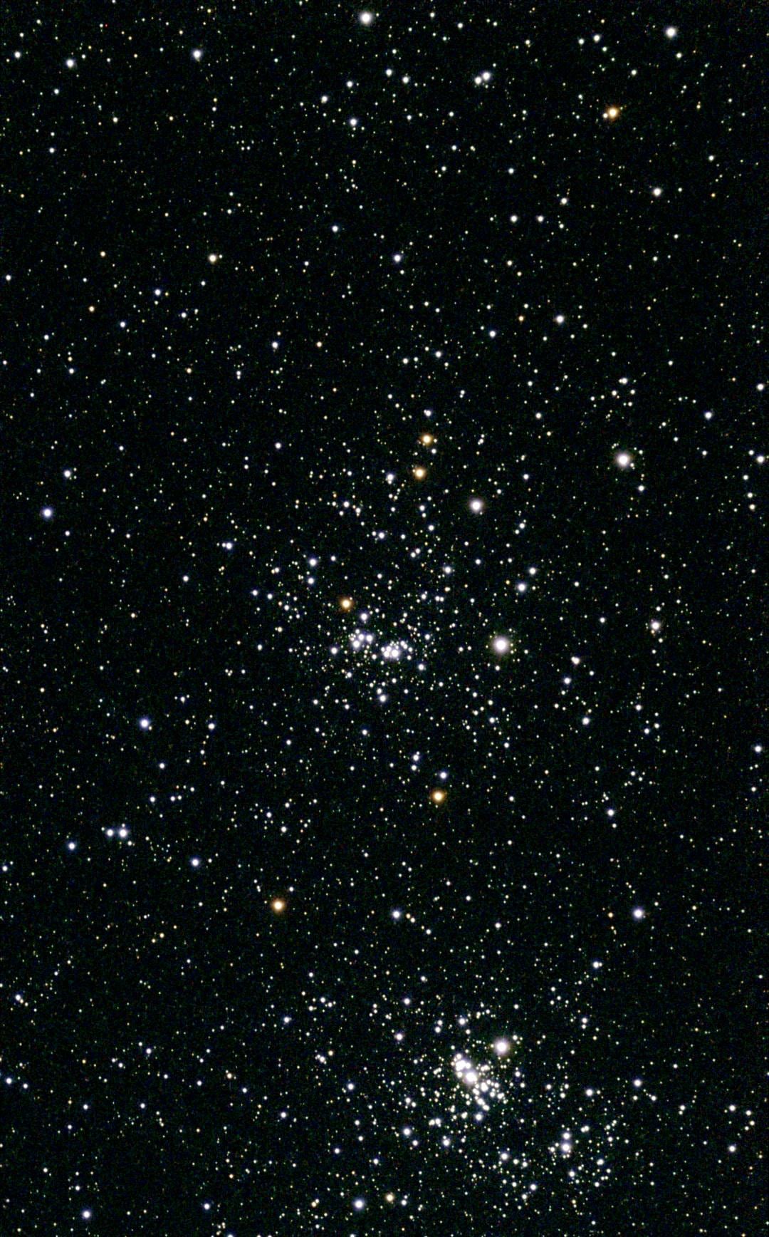 Chi Persei (χ Persei) is a bright, open star cluster (NGC 884) in the constellation Perseus, which, together with its neighbor h Persei (NGC 869), forms a double star cluster visible to the naked eye as a nebulous patch. Both clusters are relatively young—around 14 million years old—and consist of hot, blue, and white stars. Red giants are also present.