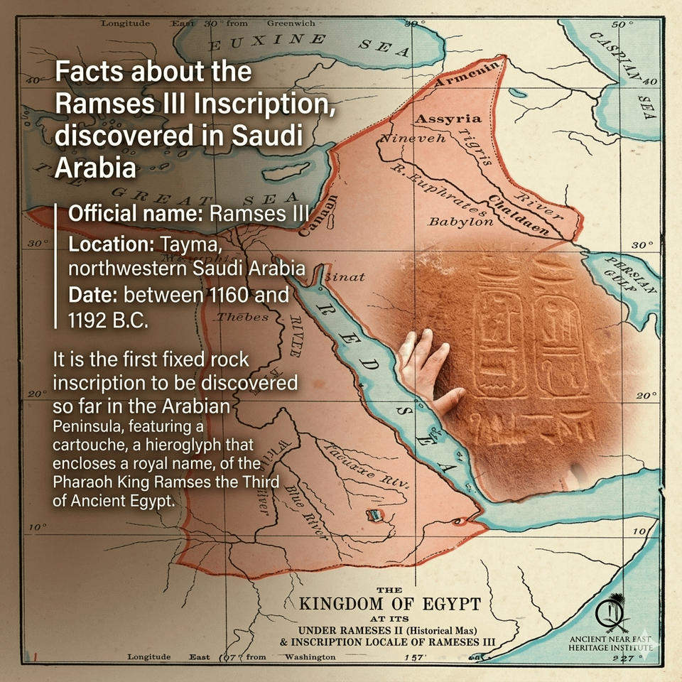 ​Deep in the oasis of Tayma, Saudi Arabia, archaeologists discovered something that shouldn't be there: a royal inscription (Cartouche) of Ramesses III. This isn't a portable artifact; it’s a rock-cut inscription, a boundary marker of an empire stretching its iron grip toward the incense routes.