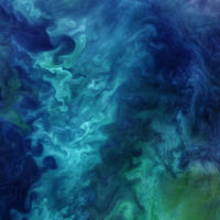Taken from observational satellite Landsat-8 in June 2018, this image of the Chukchi Sea illuminates colorful blooms of phytoplankton. Cool nutrient-rich water from the Bering Sea meet warm, less-salty Alaskan coastal water to create these patterns. The blooms can be seen even through deep Arctic ice cover.