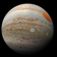 During a close pass of Jupiter in February 2019, NASA’s Juno spacecraft captured the gas giant planet and its Great Red Spot, which is the site of a massive storm on the planet’s surface. This view was created by citizen scientist Kevin M. Gill by compiling multiple images and data from the JunoCam. Juno was launched in 2011 and reached Jupiter in 2016. Its sole mission is to explore, study, and map the planet.