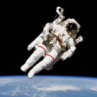 In 1984, Mission Specialist Bruce McCandless II took the historic first untethered spacewalk. Floating a few meters away from Space Shuttle Challenger, he spent four hours in the Manned Maneuvering Unit (MMU). McCandless logged more than 300 hours in space during his long career with NASA.