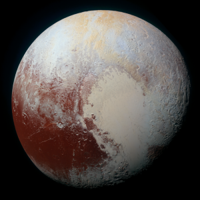 Pluto’s color variations were captured by NASA’s New Horizons space probe in 2015. The enhanced image shows the marbling effect of the dwarf planet’s diverse landforms. Pluto has mountains and plains with blue skies as well as ice and red snow.