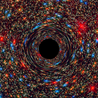 This computer-simulated image shows a supermassive black hole, weighing 17 billion suns, discovered in a sparsely populated area of the universe with the NASA’s Hubble Space Telescope and the Gemini Telescope in Hawaii. Black holes were previously believed to be located in very large galaxies in densely populated clusters. The black region in the center is the event horizon, where no light can escape from the black hole’s powerful gravity.
