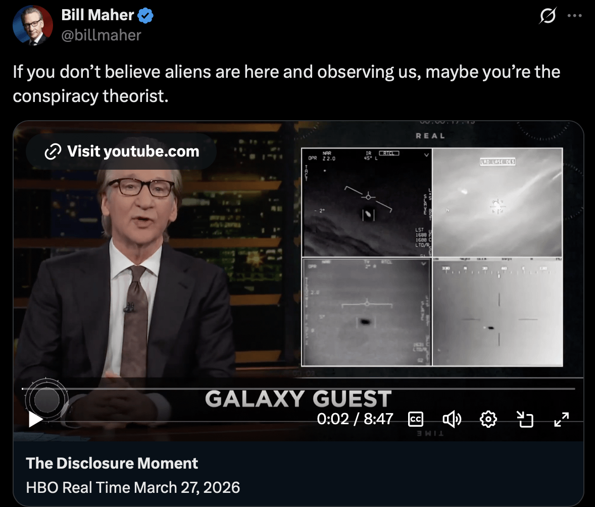 Bill Maher – “If you don’t believe aliens are here and observing us, maybe you’re the conspiracy theorist”