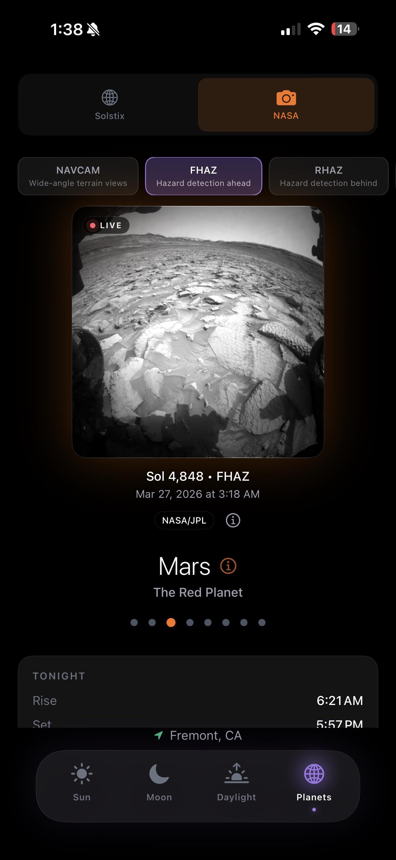 The Mars section connects directly to NASA’s Curiosity rover. Six cameras to switch between. NAVCAM for wide terrain views. MASTCAM for high-res panoramas. CHEMCAM for rock analysis. MAHLI for extreme close-ups. Front and rear hazard cams. Live imagery with Sol count and timestamps. It’s honestly surreal scrolling through photos taken on another planet yesterday.