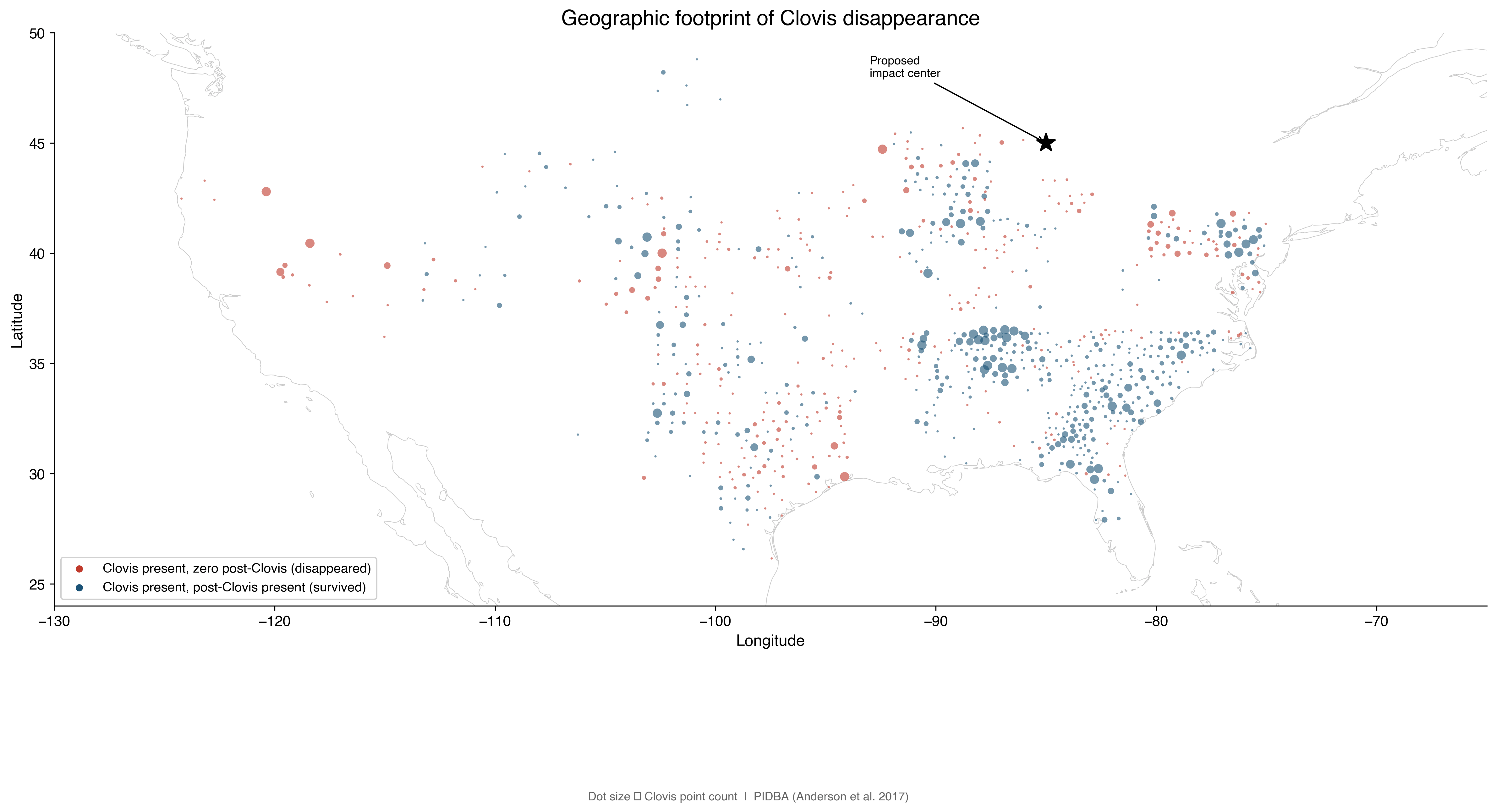 The Northeast collapsed. Michigan, Nevada, Oregon: total disappearance. Every Clovis toolmaker vanished.