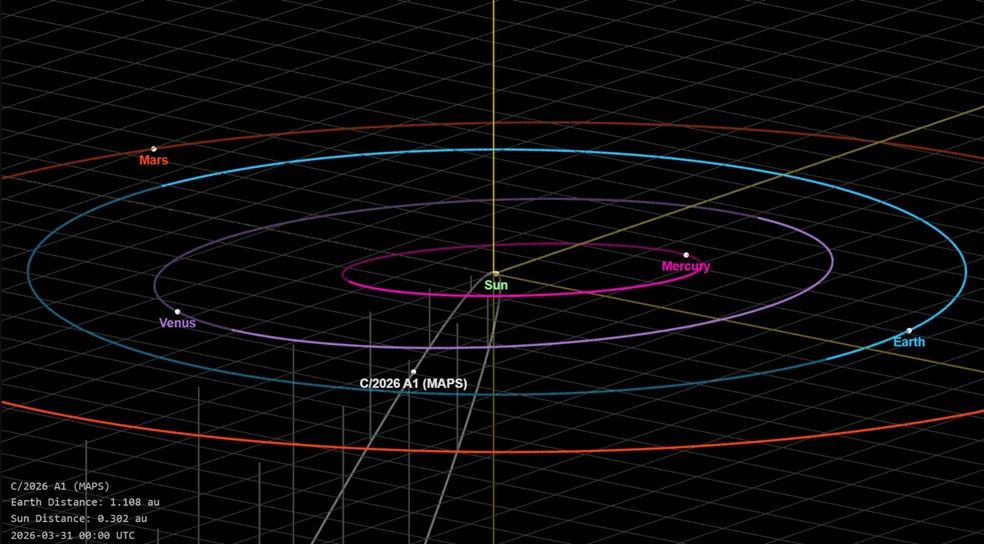 Designated C/2026 A1 (MAPS), this comet was spotted on January 13 by four French astronomers from Chile. At that time, it displayed a very faint brightness, barely detectable by amateur telescopes, but its glow increased rapidly in the weeks following its discovery.