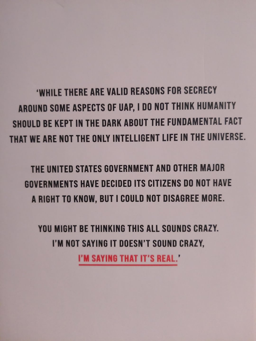 'WHILE THERE ARE VALID REASONS FOR SECRECY AROUND SOME ASPECTS OF UAP, I DO NOT THINK HUMANITY SHOULD BE KEPT IN THE DARK ABOUT THE FUNDAMENTAL FACT THAT WE ARE NOT THE ONLY INTELLIGENT LIFE IN THE UNIVERSE.