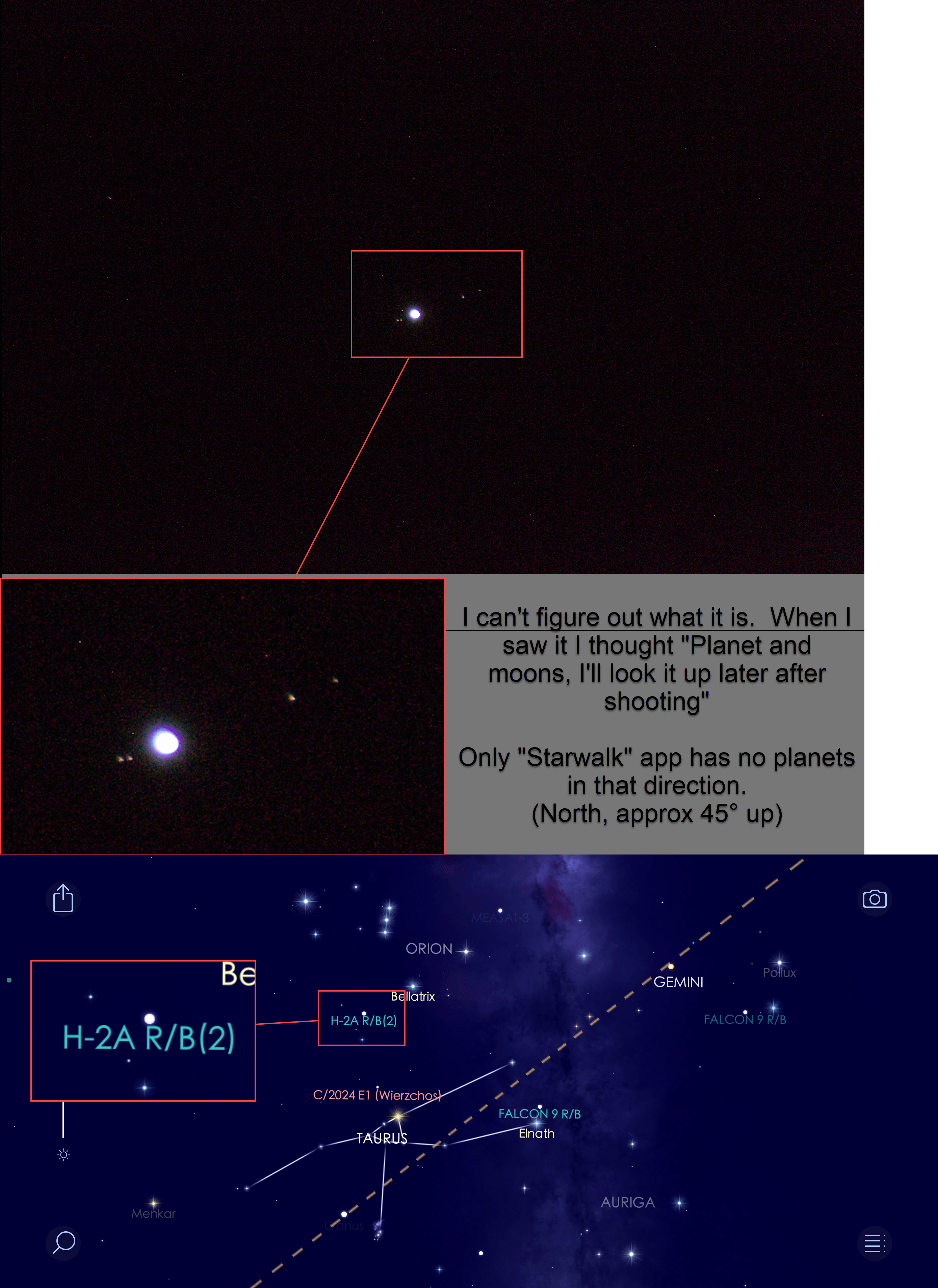 According to "Starwalk2" app on my iPhone I shot just above Taurus… No planets as I was originally thinking. So what did I shoot? H-2A r/B(2) ? and what is that?