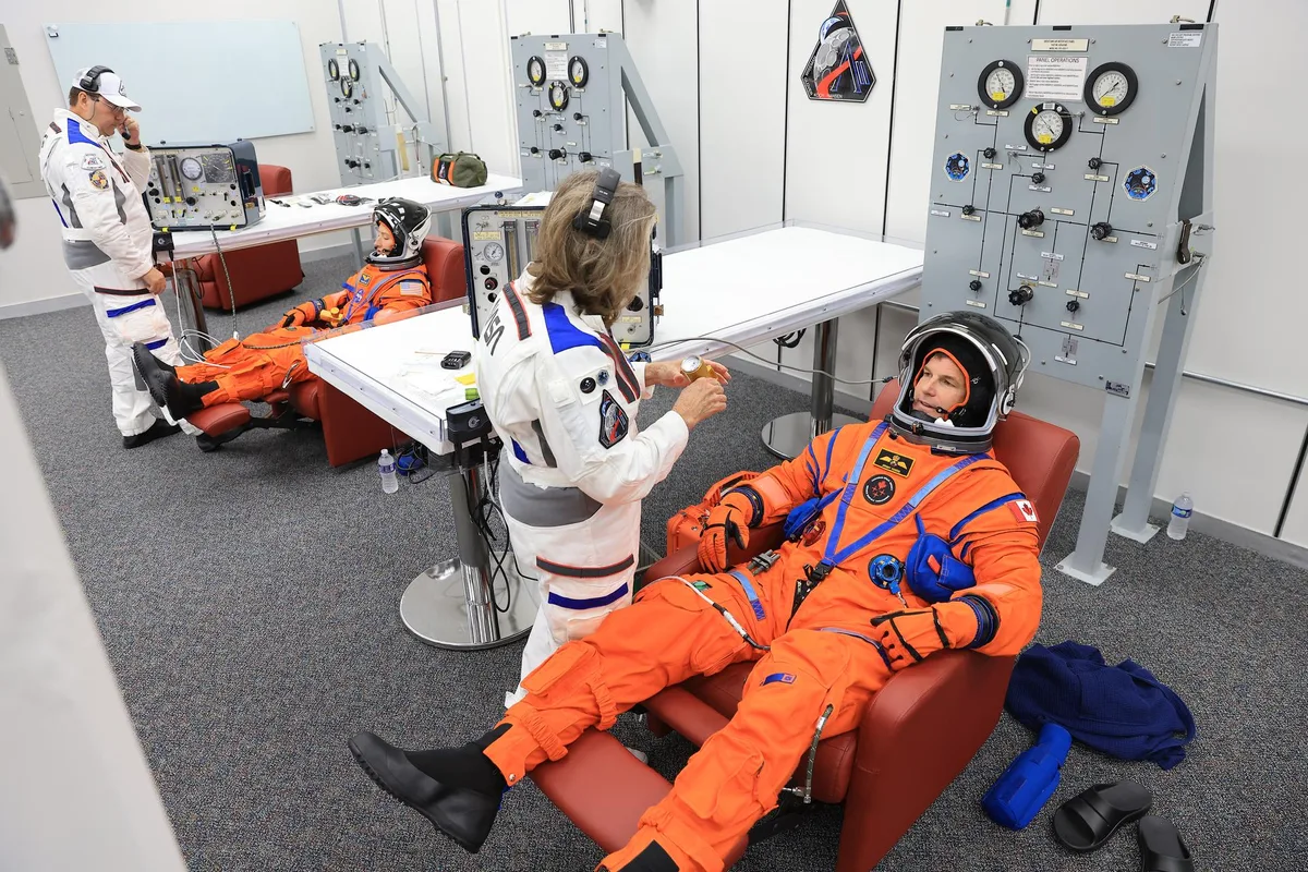 Before heading out on their historic mission, the crew had to complete leak checks on their space suits.