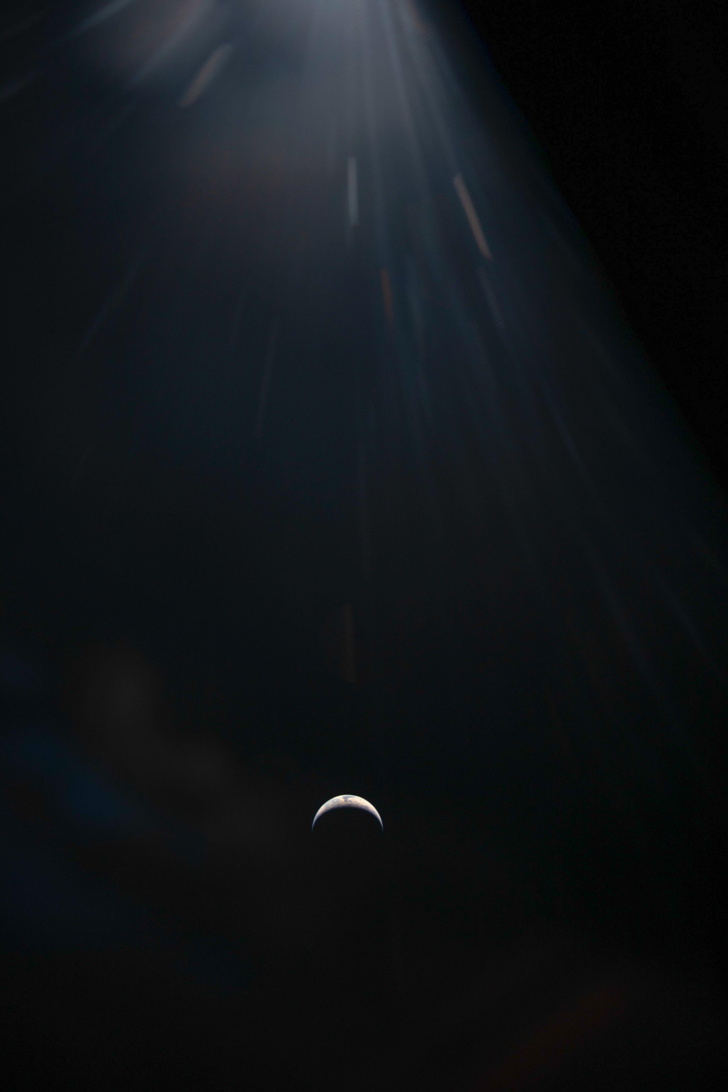 An illuminated sliver of Earth set against the blackness of space is seen through the window of the Orion spacecraft in this photograph from the Artemis II crew on the third day of their journey to the Moon.