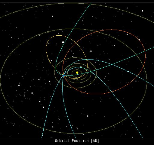 In this diagram of the inner solar system, all of the fireball orbits intersect at a single point–Earth. The orbits are color-coded by velocity, from slow (red) to fast (blue). [Larger image] [movies]