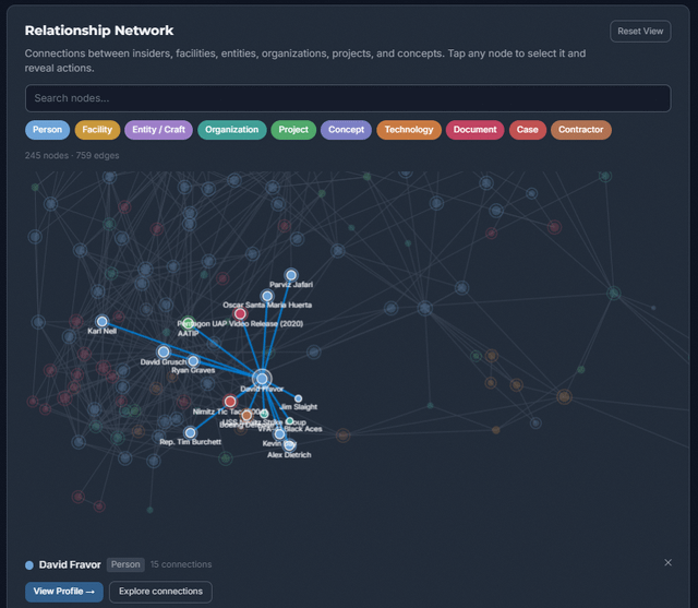 The Explore section has a force-directed relationship network with every insider, organization, program, and technology as a node. Click any node and it navigates straight to that profile. There's a separate Claims Corroboration network that cross-references which claims have multiple independent sources backing them. Program lineage, oversight hierarchy, and a geographic incident map plotting 27 cases and 148 geocoded historical events are all separate visualizations. All of it is at decur.org/explore.