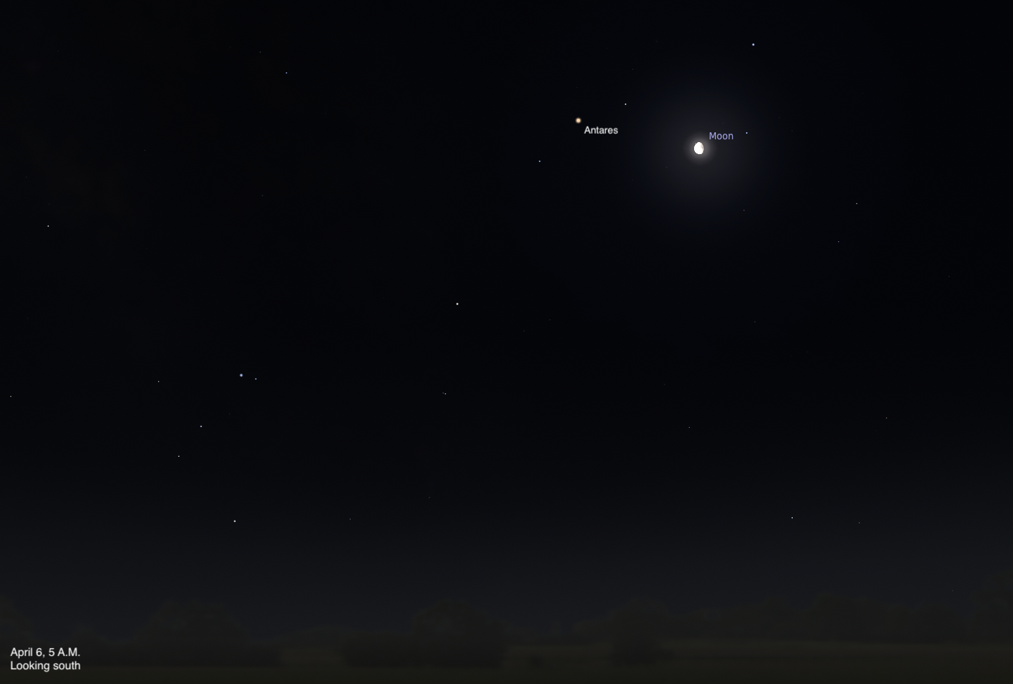 The Moon passes 0.6° south of Antares at 4 P.M. EDT on April 6, with the two visible together in the early-morning sky prior to the passage.