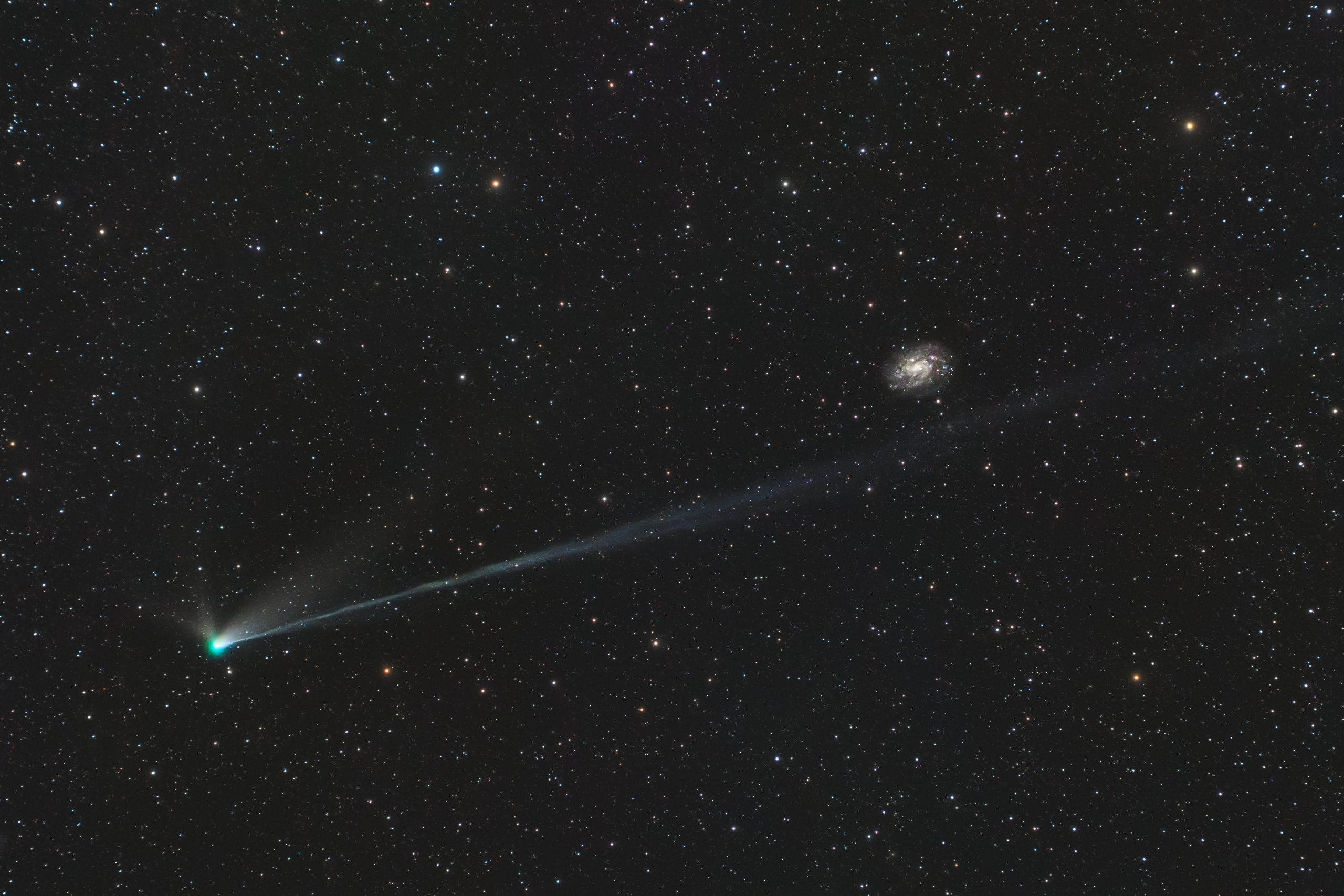 A multi-tailed Comet C/2024 E1 (Wierzchoś) passes spiral galaxy NGC 300 in a stunning shot from February 2026. Credit: José J. Chambó