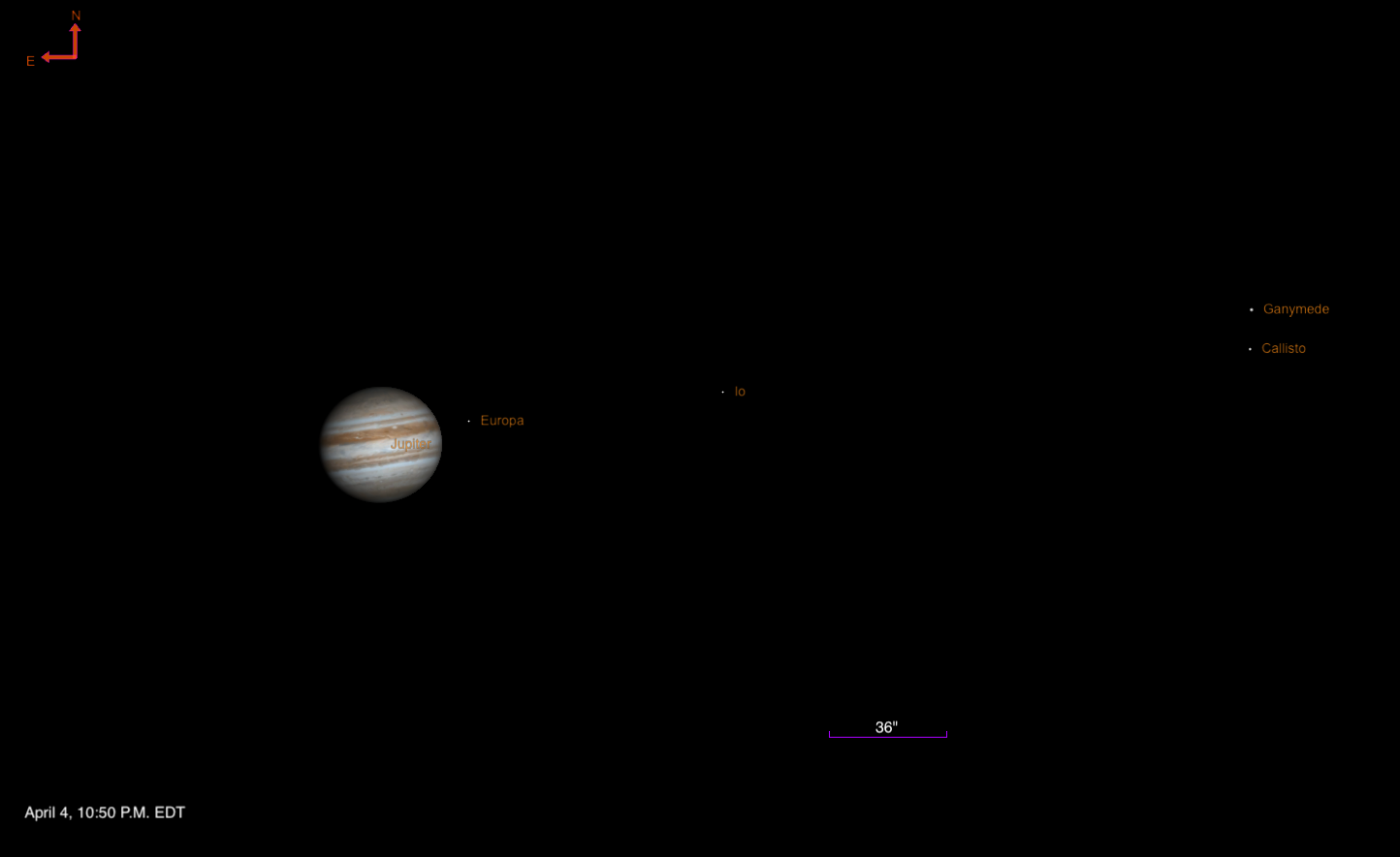 Meanwhile, Europa takes some three hours to cross behind Jupiter but emerges into the planet’s shadow, staying invisible even once it has moved past the limb. Only observers in the western half of the U.S. will be able to catch its eventual reappearance, some 35” east of the eastern limb around 2 A.M. PDT on April 5.