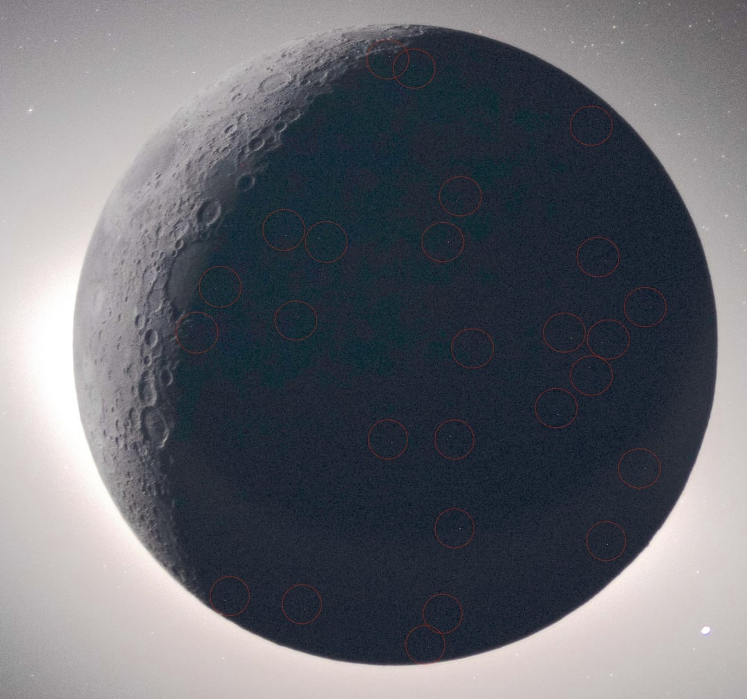 I uploaded the original un-cropped version as the final photo in this post – and in my best estimation there is not a consistent distribution of other light sources in the frame to cause lens or craft viewport reflection in the positions they are in on the moon.
