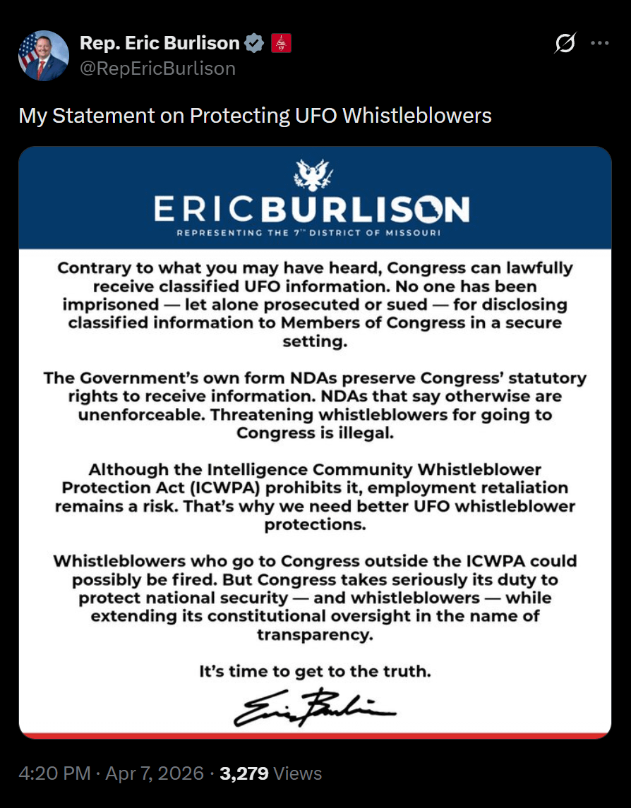 SS: The provided statement from Representative Eric Burlison addresses the legal rights and risks associated with disclosing classified Unidentified Aerial Phenomena (UAP) information to Congress. Burlison asserts that Congress has the lawful right to receive such data and emphasizes that no individual has faced prosecution for sharing it within secure, authorized settings. He further contends that standard government non-disclosure agreements (NDAs) cannot legally obstruct this congressional oversight and that any attempts to use them for that purpose are unenforceable.