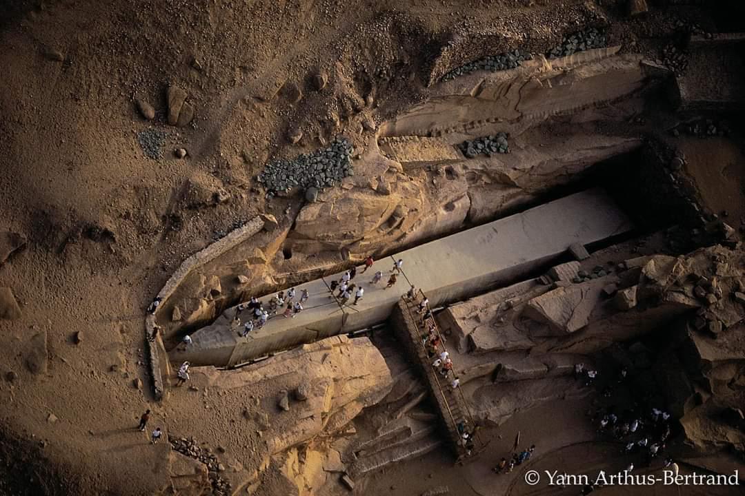 Those trenches are man-sized because this unfinished obelisk was painstakingly carved by men who were down in those trenches, using copper drills and chisels, dolerite hammers, wooden wedges, and abrasive sand. And after they spend years doing that, they had to abandon it because it had cracks.