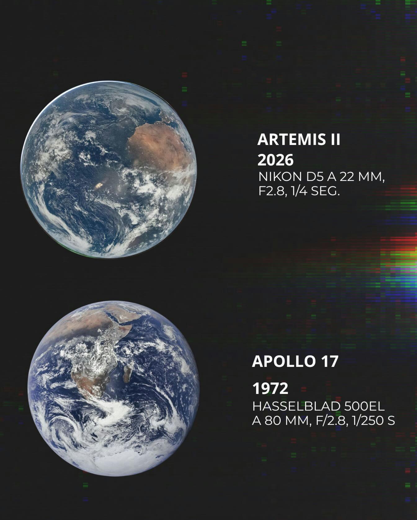Apolo 17 (1972) Hasselblad 500EL | 80 mm | f/2.8 | 1/250 s Vs Artemis II (2026) Nikon D5 | 22 mm | f/2.8 | 1/4 s