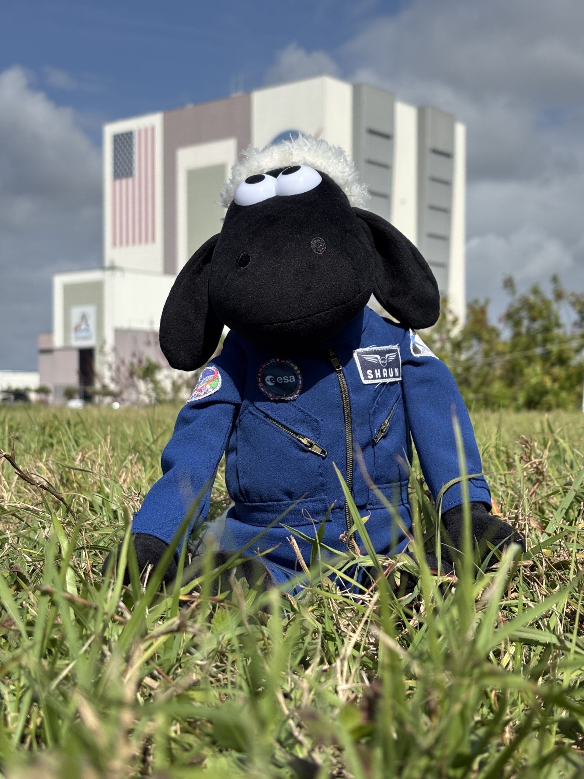 Shaun the Sheep in front of the iconic Vehicle Assembly Building at NASA’s Kennedy Space Center.