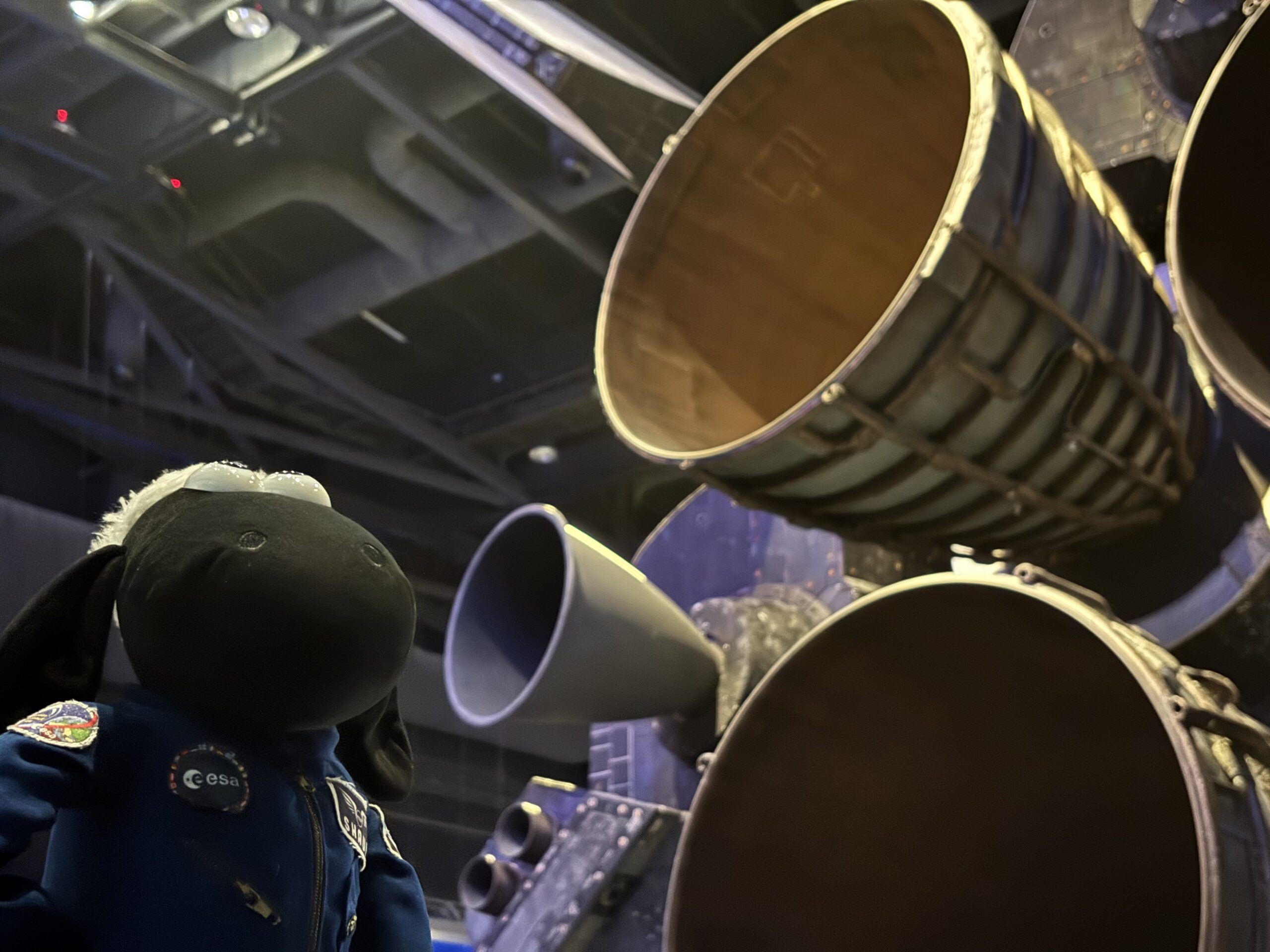 Shaun the Sheep by the engines of Atlantis – the cone-shaped engine just next to his snout is the OMS, or Orbital Manoeuvering System engine, that is now the main engine of ESM-2.