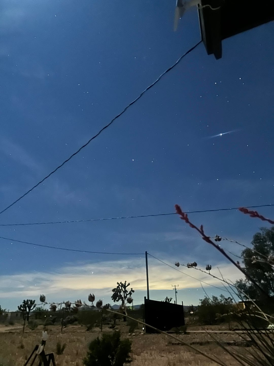 Low, bright, shape-shifting orb/ sky snake serpent seen in the sky of Landers, California on March 29th, 2026 at 11:11PM. This was my last night on a solo desert trip from Los Angeles. Earlier that day, I stopped by the Integratron (iykyk if you don’t look it up & George Van Tassel). It was only 9 minutes from my airbnb and since the sound baths sold out that weekend, I just wanted to stop by and possibly buy some books from the gift shop if they were open. My airbnb had some books under the coffee table, including 4 of Van Tassels research and writings which I was heavily inspired by and felt was divine to be at my airbnb. I was back at my airbnb, sky/star gazing and lowkey conjuring ufos. I saw a bright object that looked low and the sky was a bit overcast at the time. I had my Sony mirrorless digital camera with me and snapped a photo of the snake object. It didn't seem to be moving much. I checked my sky guide app to show me if it was a star, planet, or satellite, and it was none of them, but a bright object did appear on the AR version of the app, Sky Guide. I then recorded on my iphone for a bit(still learning how to film and take photos with my camera at night). I didn't feel any certain type of way when observing, but knew it was anomalous so decided to take photos and record.Â