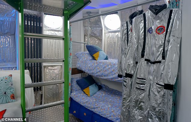 The walls are fitted with multiple layers of insulation foil originally designed by NASA, while decor consists of blow-up alien dolls, alien-themed cushions, spacesuits, astronaut helmets, black and yellow hazard tape, and cages of ‘exposed’ wiring.