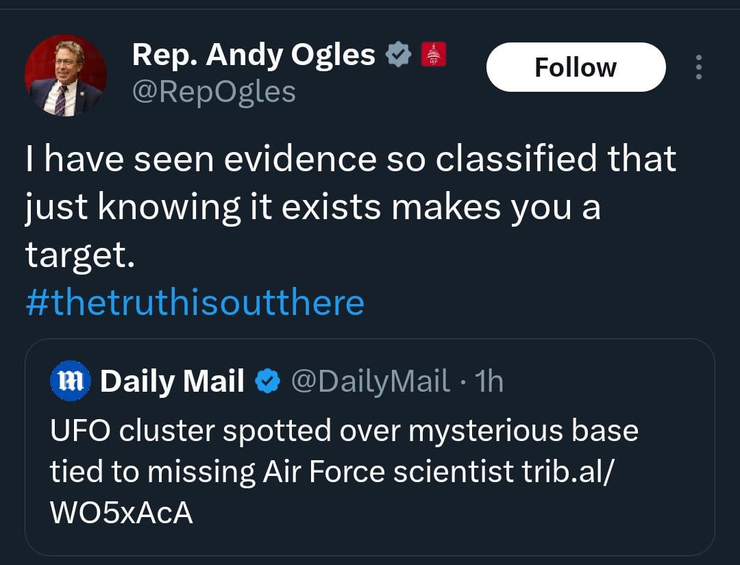 I have a hard time believing MAGA types (and this guy is hardcore MAGA). Knowing that someone as boring and spineless-Democrat’s spineless-Democrat co-sponsored the UAPDA makes me think there’s a lot more to it, but who believes what, what’s passage material meant to blackmail and trap who…who knows