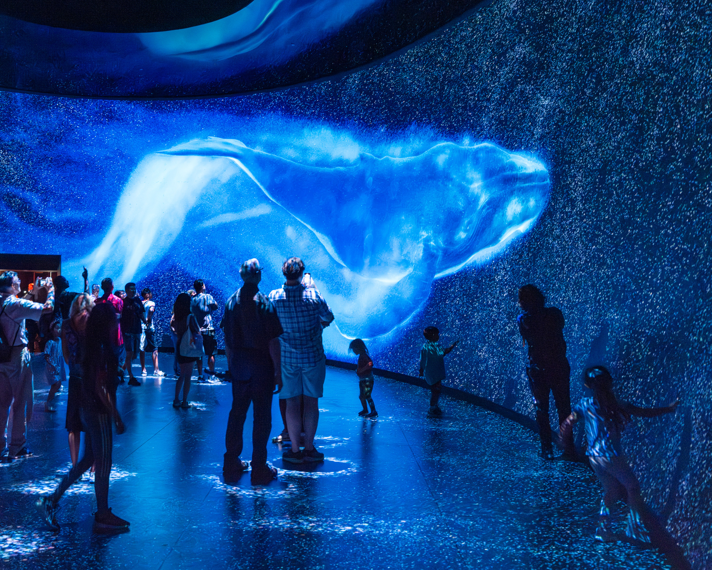 You are on the water, somewhere in the middle of a shimmering San Diego Bay, with the sun setting on the horizon in front of you and a small sailboat floating behind you. Waves lap. Seagull cries fill the air. Whoosh! Suddenly, you are plunging down—fast—encircled by walls of water. You look around the darkness to discover you are now deep in the ocean, surrounded by glowing plankton and a host of palm-sized brightly colored krill that begin swarming toward the surface.