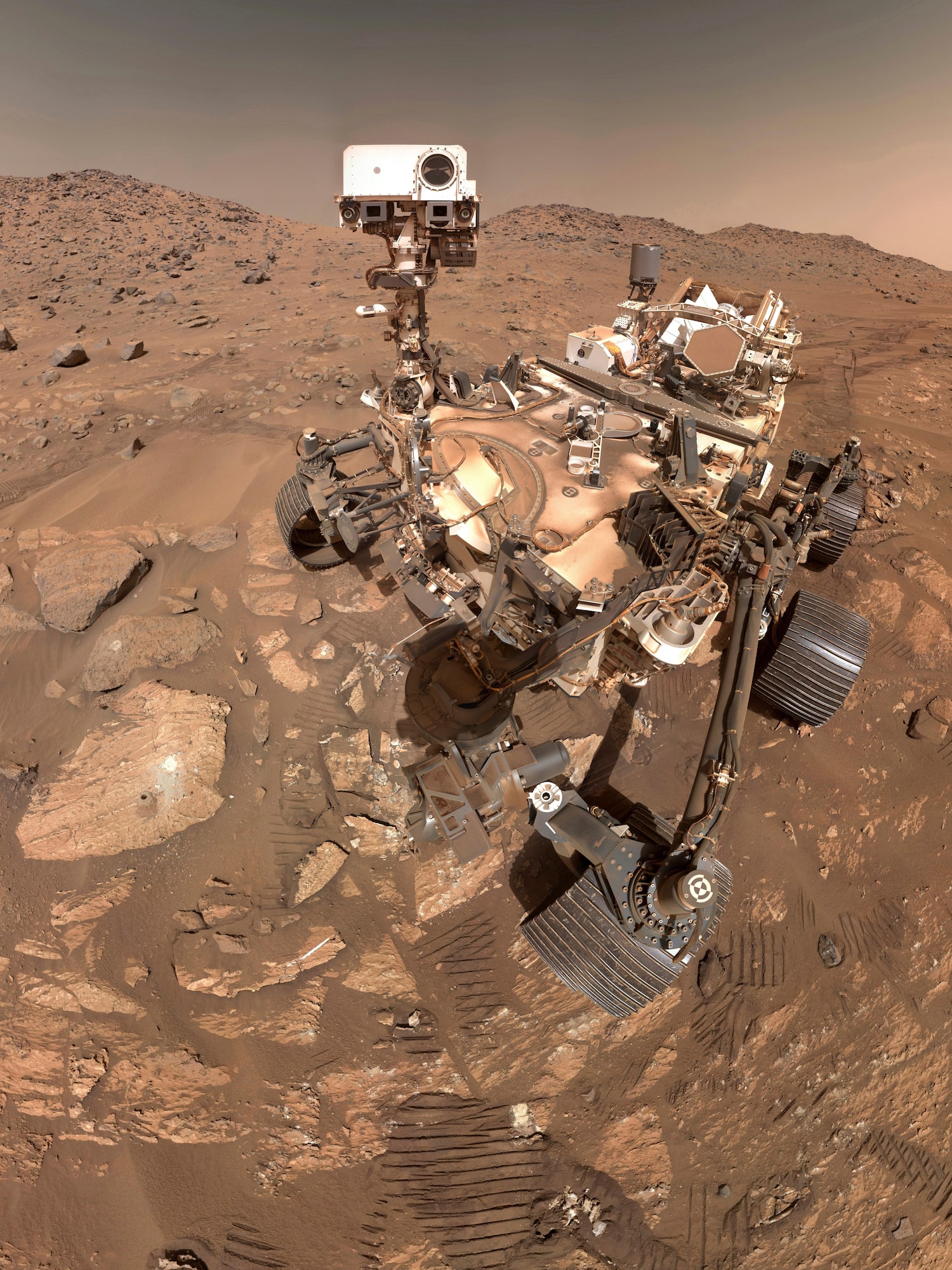 A selfie of the Perseverance Mars rover on July 23, 2024. The image is made up of 62 individual images that were stitched together.