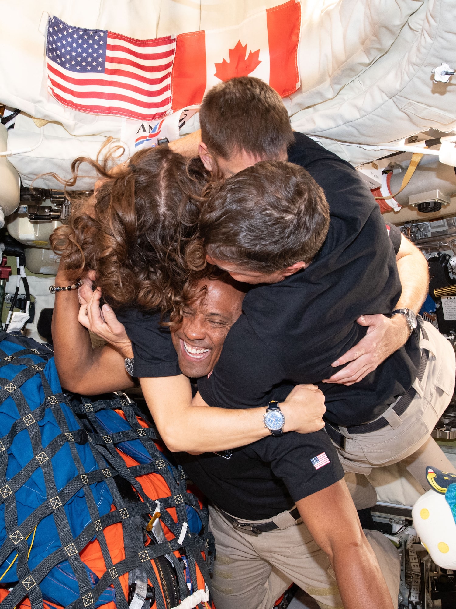 Artemis II crew members, mission specialist Christina Koch (left), mission specialist Jeremy Hansen (top), commander Reid Wiseman (right), and pilot Victor Glover (bottom), share a group hug inside the Orion spacecraft on April 8, 2026.
