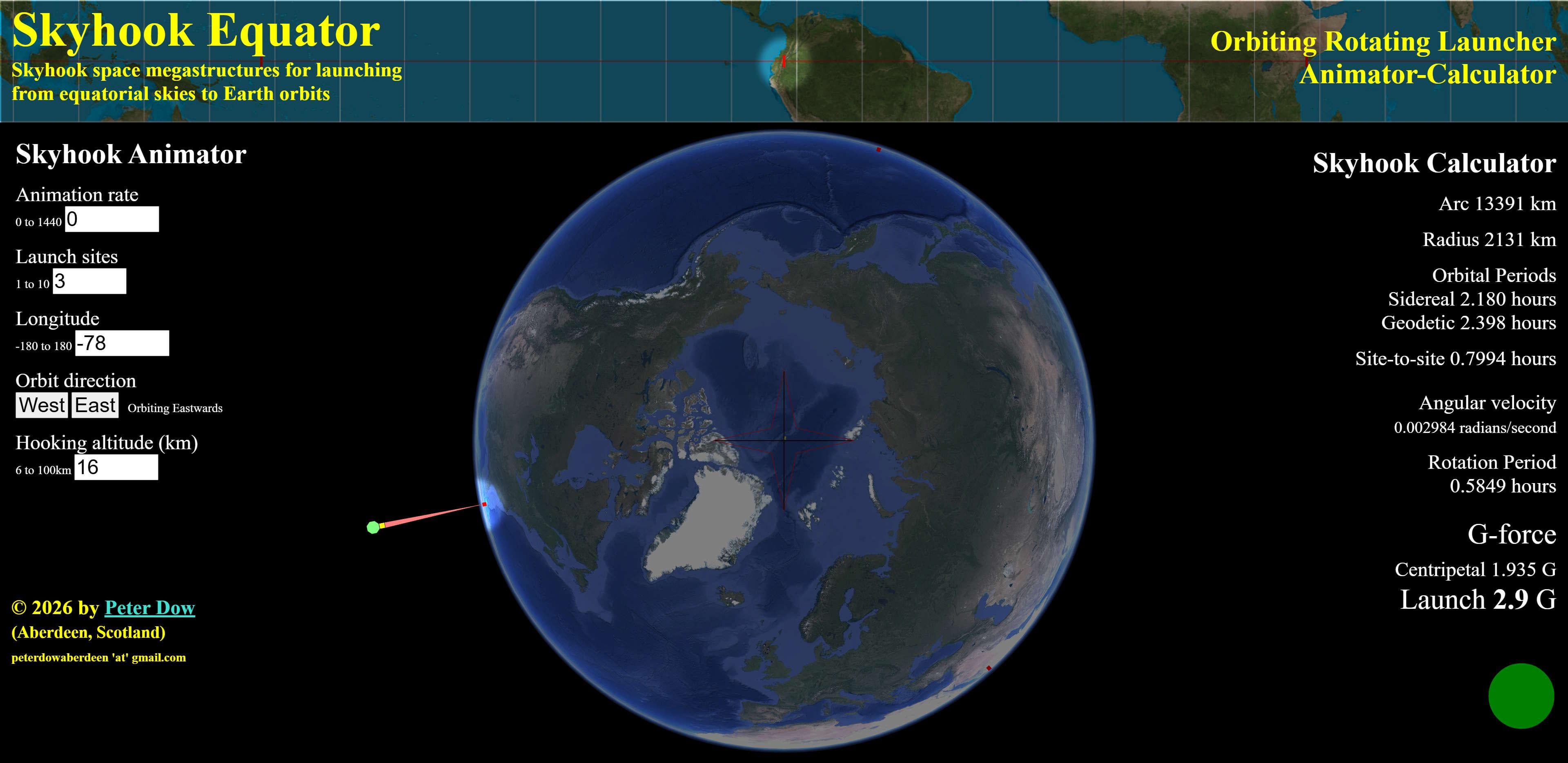 This links to my WordPress blog which in turn links to my Skyhook Equator web-page script program which animates selected sizes of skyhooks launching from equatorial skies to Earth orbits and which calculates launch G-forces etc.