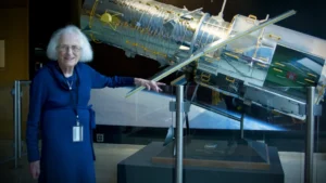 Nancy Grace Roman, who passed away in 2018 at the age of 93, stands next to a scale model of the Hubble Space Telescope outside the Hubble control center at NASA’s Goddard Space Flight Center in Greenbelt, Maryland in an undated photograph. NASA