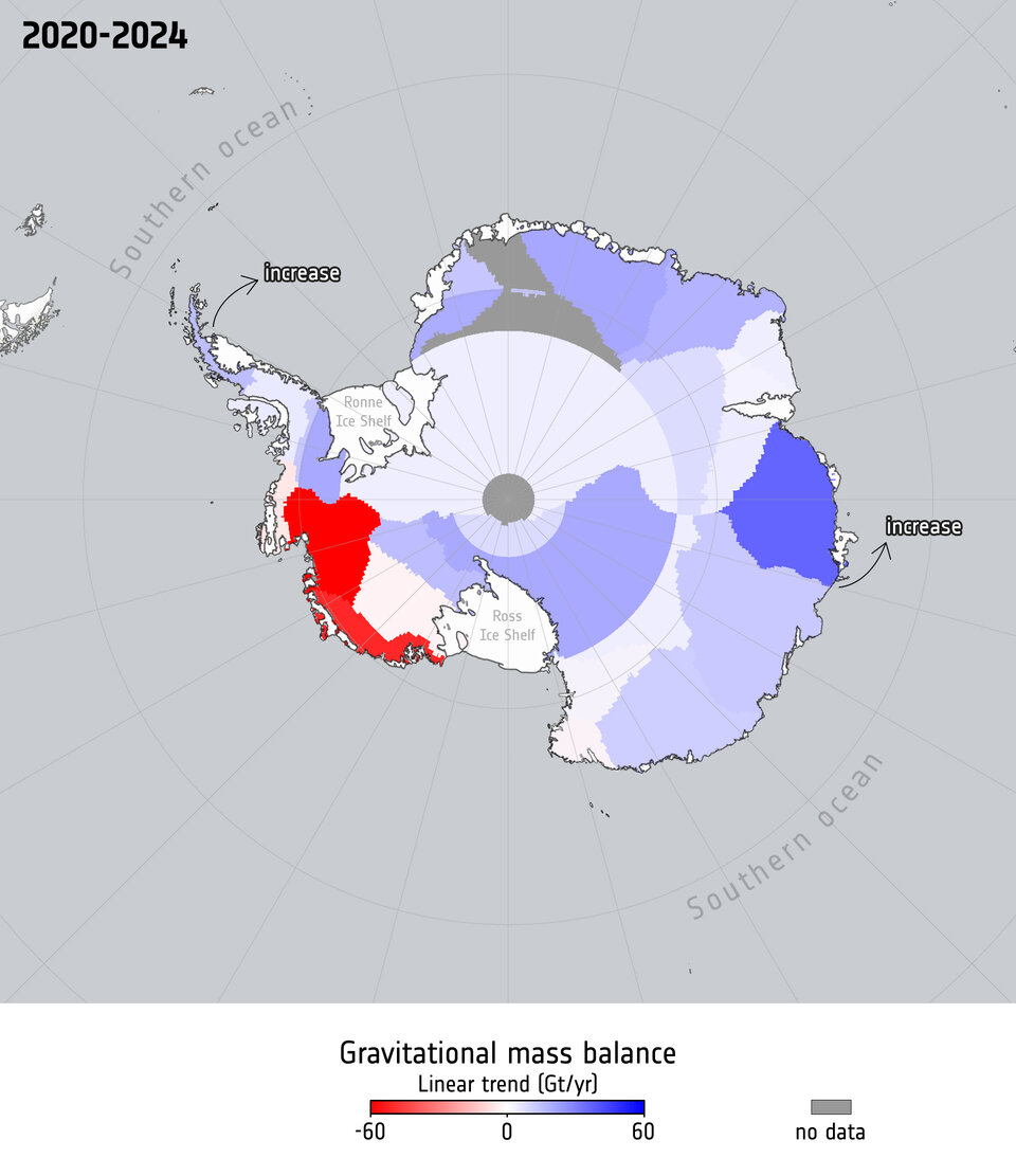 According to the study’s lead author, Marlen Kolbe, this slowdown switched to a net gain at a rate of roughly 68 gigatonnes per year, between 2020 and 2024. As of late 2025, there is no clear indication of a return to net mass loss, though whether the trend will continue or level off remains unclear and will also depend on changes in dynamical discharge.