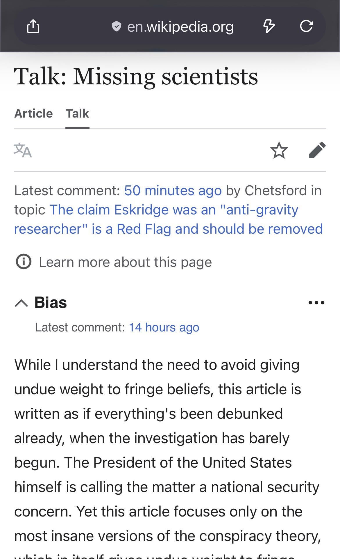 https://en.wikipedia.org/wiki/Talk:Missing\_scientists# This is insane, blatant narrative manipulation/misinformarion occurring in real time. Eyes up folks. by slow70