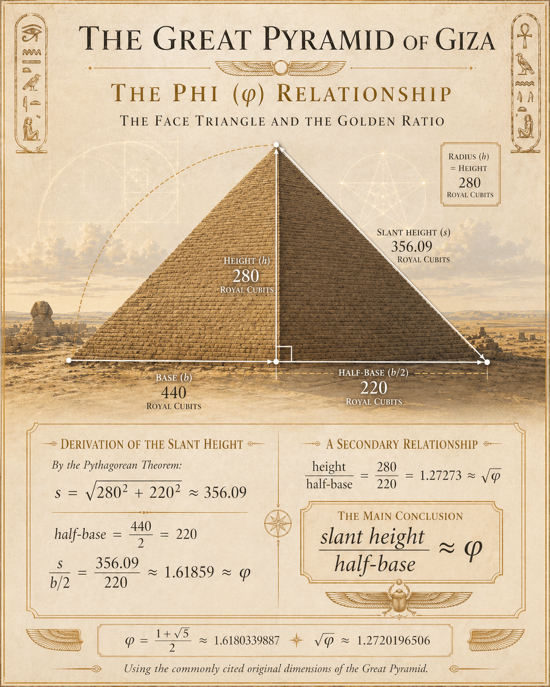 φ 356.09 ÷ 220 ≈ 1.618 ≈ φ The pyramid’s face triangle is close to golden-ratio geometry.
