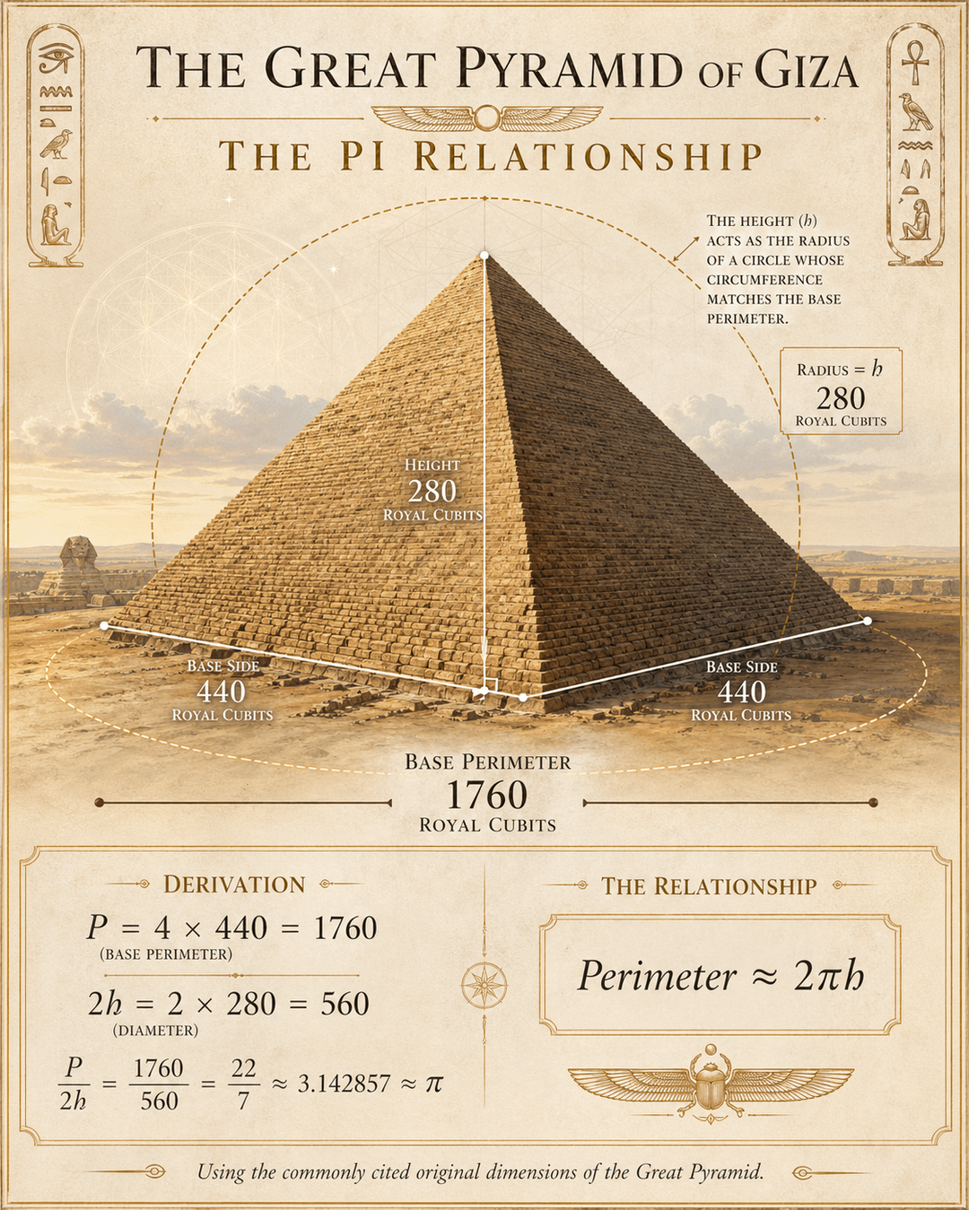 π 1760 ÷ (2 × 280) = 22/7 ≈ π The base perimeter is close to a circle’s circumference if the pyramid height is the radius.