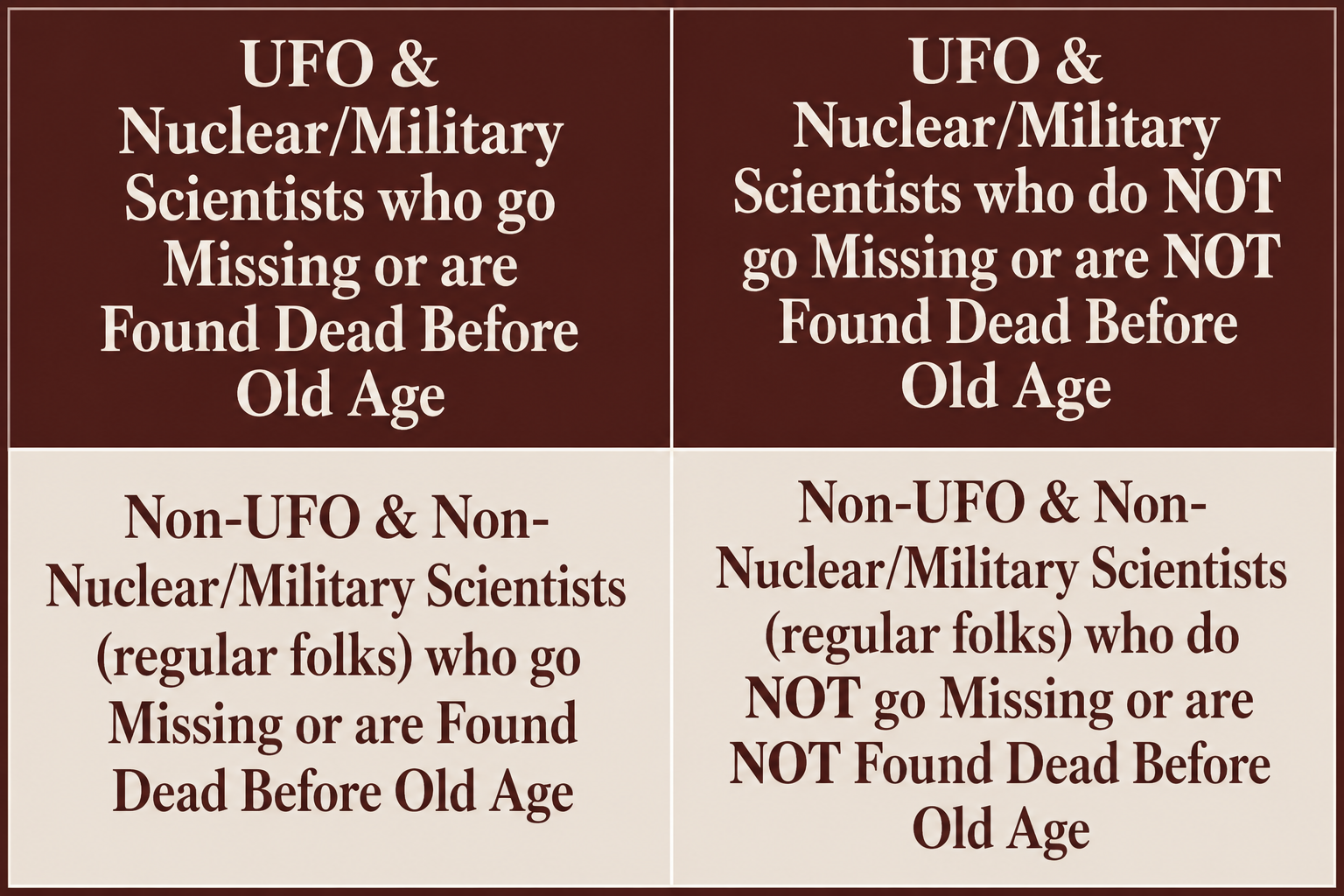 More generally, this phenomenon is also emblematic of what I call the fallacy of excluded exceptions, an illustration for which can be seen in a 2×2 matrix of four cells (see figure below). Cell 1 represents our mystery, namely UFO and nuclear/military scientists who go missing or are found dead before old age. What about all the UFO and nuclear/military scientists who do not go missing or are not found dead before old age (Cell 2)? Or the non-UFO and non-nuclear/military scientists who go missing or are found dead before old age (Cell 3)? Or the non-UFO and non-nuclear/military scientists who do not go missing or are not found dead before old age (Cell 4)? Suddenly our mystery disappears. There’s nothing unusual to explain in the broader context of everything else that could happen but are ignored in our focus on just the combination we’re interested in exploring.