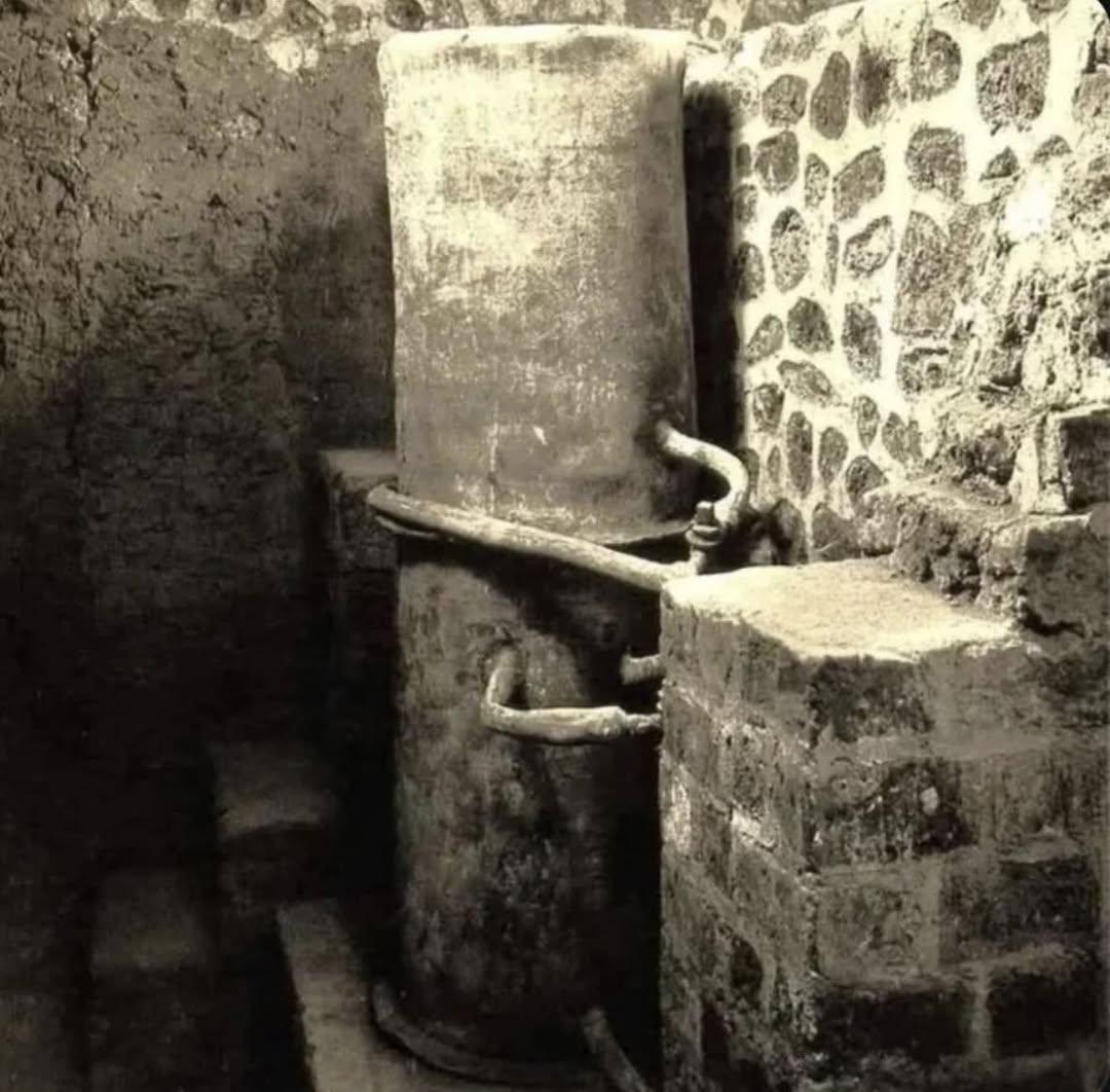 A Roman water boiler from the 1st century BCE that was discovered at Villa Della Pisanella in Boscoreale, Italy. It is one of the rarest examples to survive with its complete system of pipes and fittings intact.