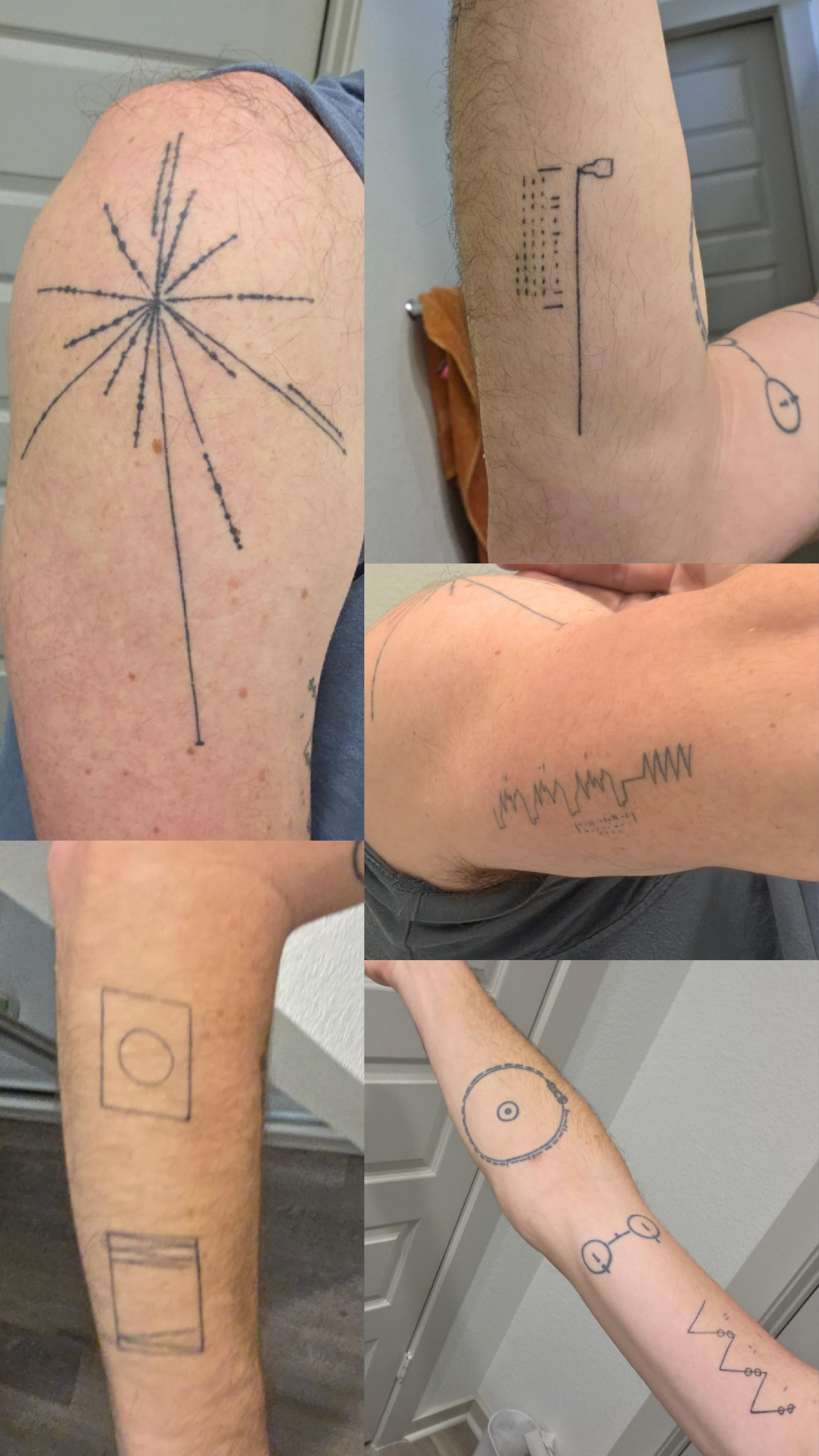 Loved seeing the pulsmar map the other day and others asked to see mine, so here ya go! The lines are very straight even if they look a bit curved from the angle/arm position. Took about 3 hours in the chair, artist was sweating the whole time with all these straight lines, but she did a great job, espcially since I know her and she'd have to look at her work every time we hang out, so the pressure was on haha. Serioulsy tho, get a trusted artist. It's kind of forever. The overhead view of the record has a pale blue dot in the center, for Carl. Funny story: my mom was like "you'll never get a job with those tattoos" but then I got a job teaching astronomy because someone in a grocery store recognized it. Take that, mom!