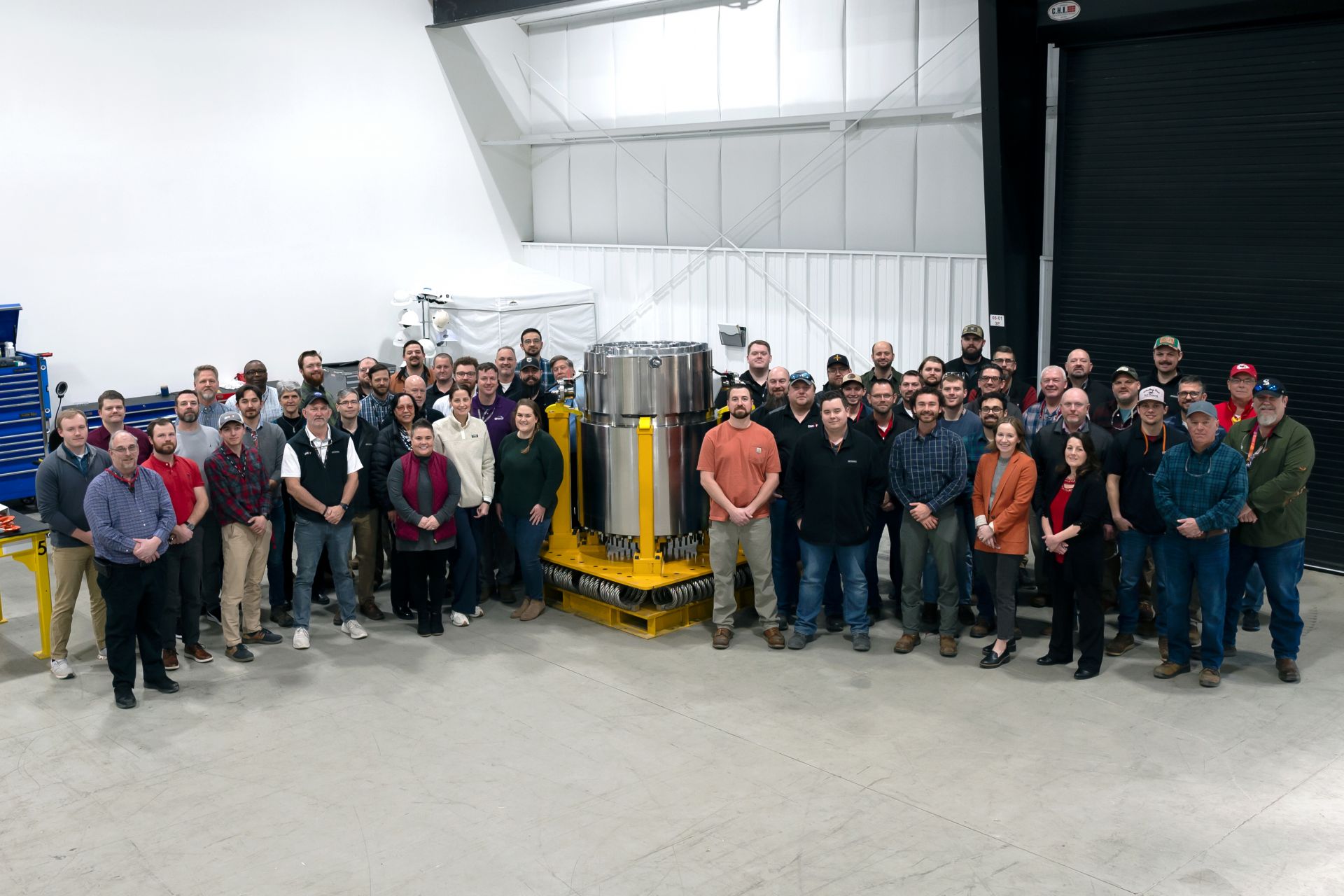 Kate Kelly, president of BWXT Advanced Technologies (front row, in orange blazer), stands with the team that designed and built the engineering demonstration unit at the BWXT Innovation Campus in Lynchburg, Va., in January 2025. (Photo: BWXT)