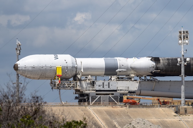 The SpaceX Falcon Heavy rocket supporting the ViaSat-3 F3 mission lies in the horizontal position at Launch Complex 39A at NASA’s Kennedy Space Center. Image: Adam Bernstein/Spaceflight Now