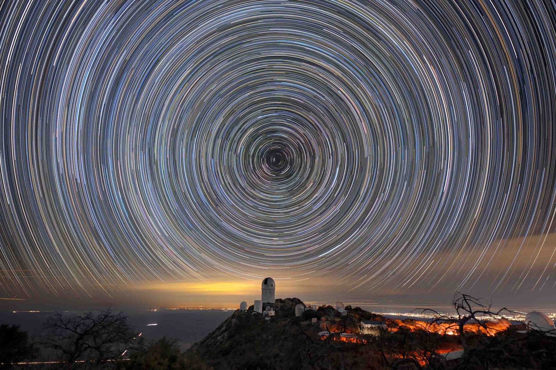 Blended star trails as they appear over the Mayall Telescope in Arizona that houses the Dark Energy Spectroscopic Instrument. DESI has completed its five-year mission and has been extended to 11 years to continue its work. (Contributed photo by Luke Tyas/Berkeley Lab and KPNO/NOIRLab/NSF/AURA)