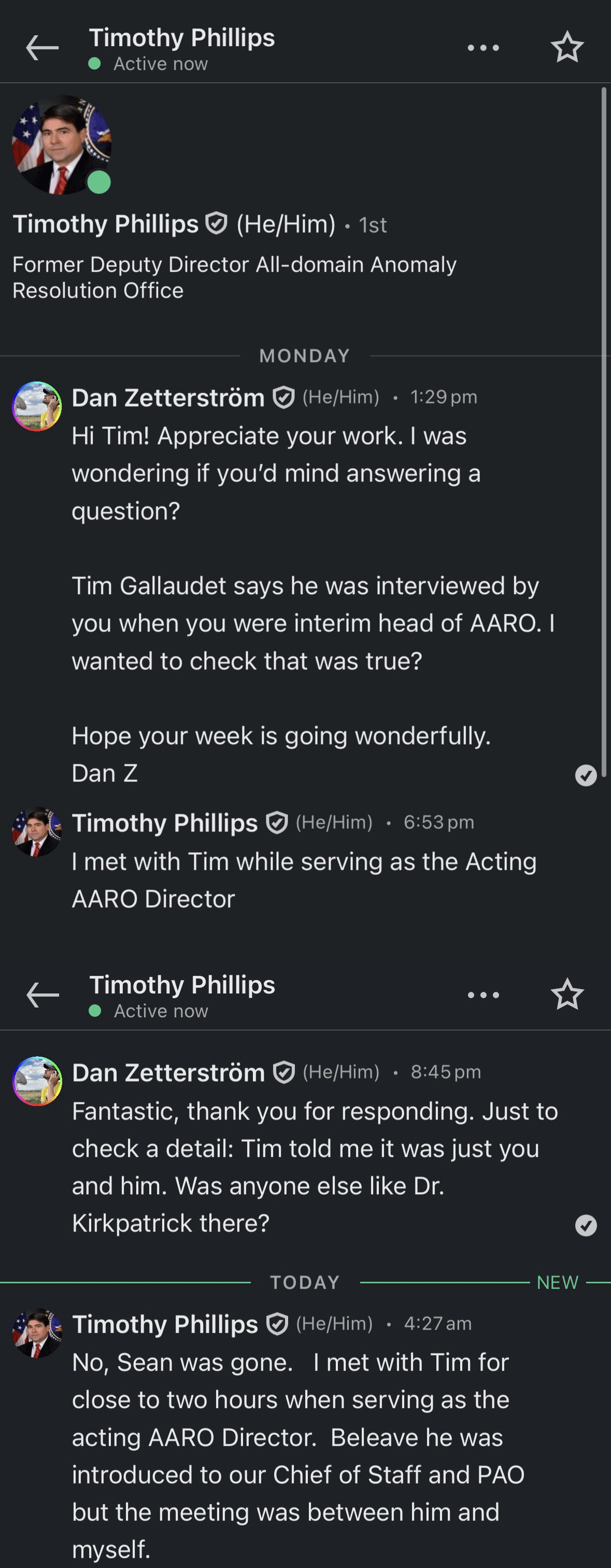 Former AARO director Sean Kirkpatrick caught in yet another lie – Former AARO Acting director Tim Phillips (who served after Kirkpatrick) confirms that only he met Former Rear Admiral Tim Gallaudet, Sean Kirkpatrick never did.