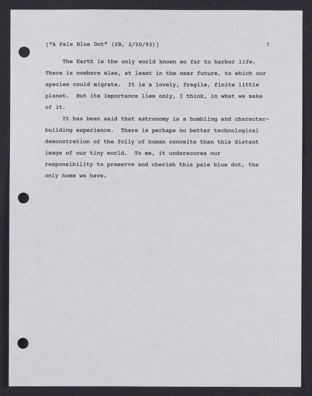 It has been said that astronomy is a humbling and character-building experience. There is perhaps no better demonstration of the folly of human conceits than this distant image of our tiny world. To me, it underscores our responsibility to deal more kindly with one another, and to preserve and cherish the pale blue dot, the only home we’ve ever known.”