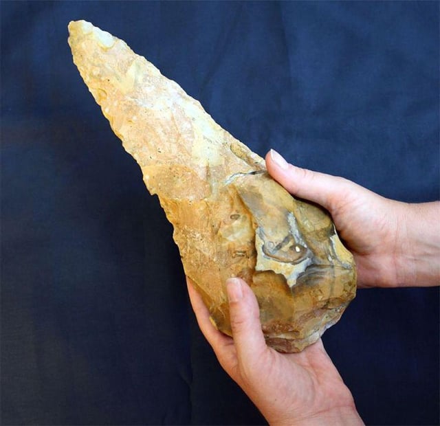 I dunno about the hand axe but it looks perfect for wedging the spiked end into and tying it to the end of a forked branch or antler to me. But I also dunno if 300,000 years ago they would know that. I suppose if they had the skills to create these things so perfectly it would be reasonable to think they could tie it to a stick and swing it like we would a steel one today.