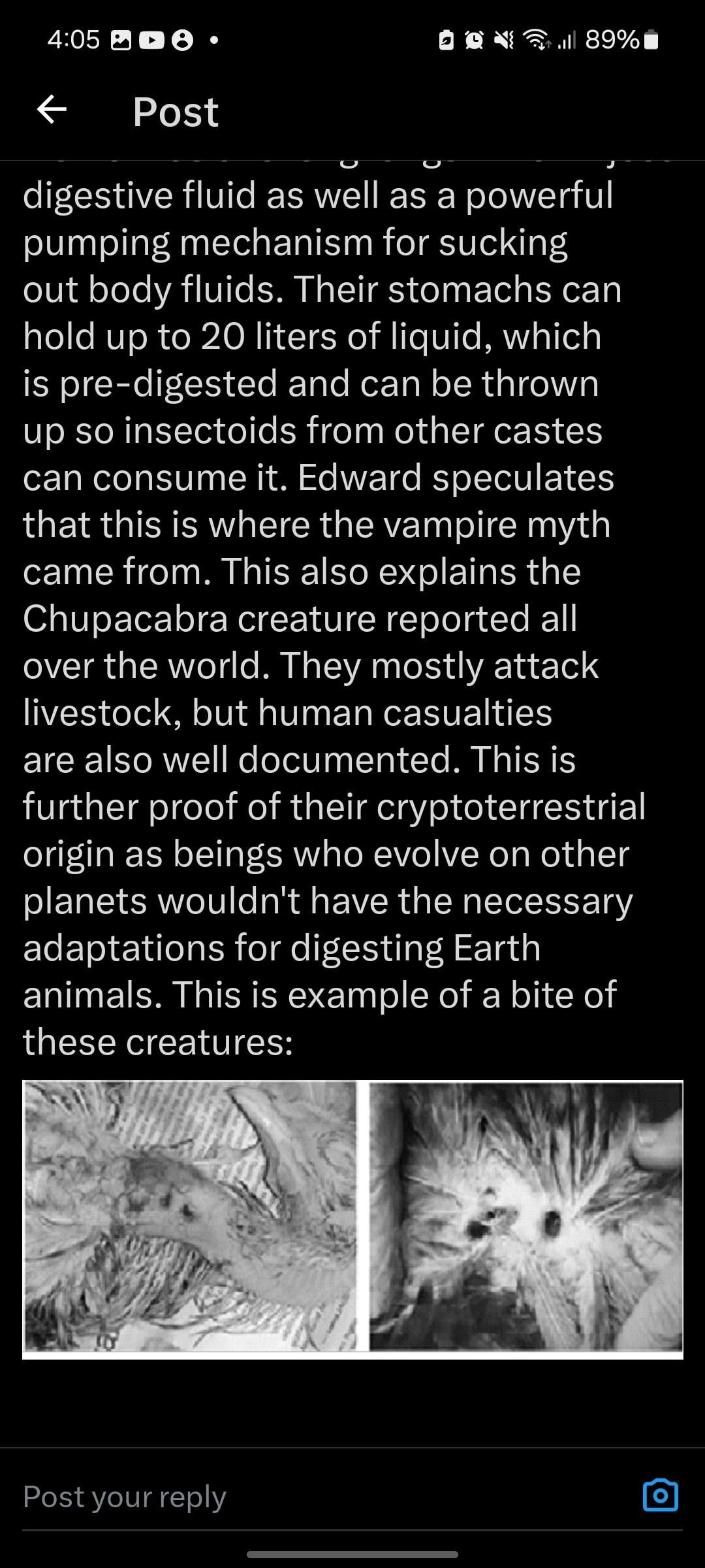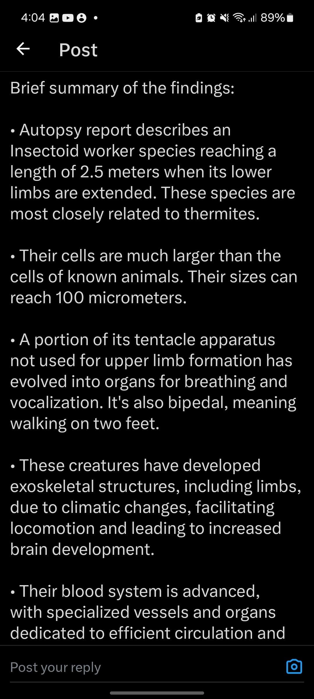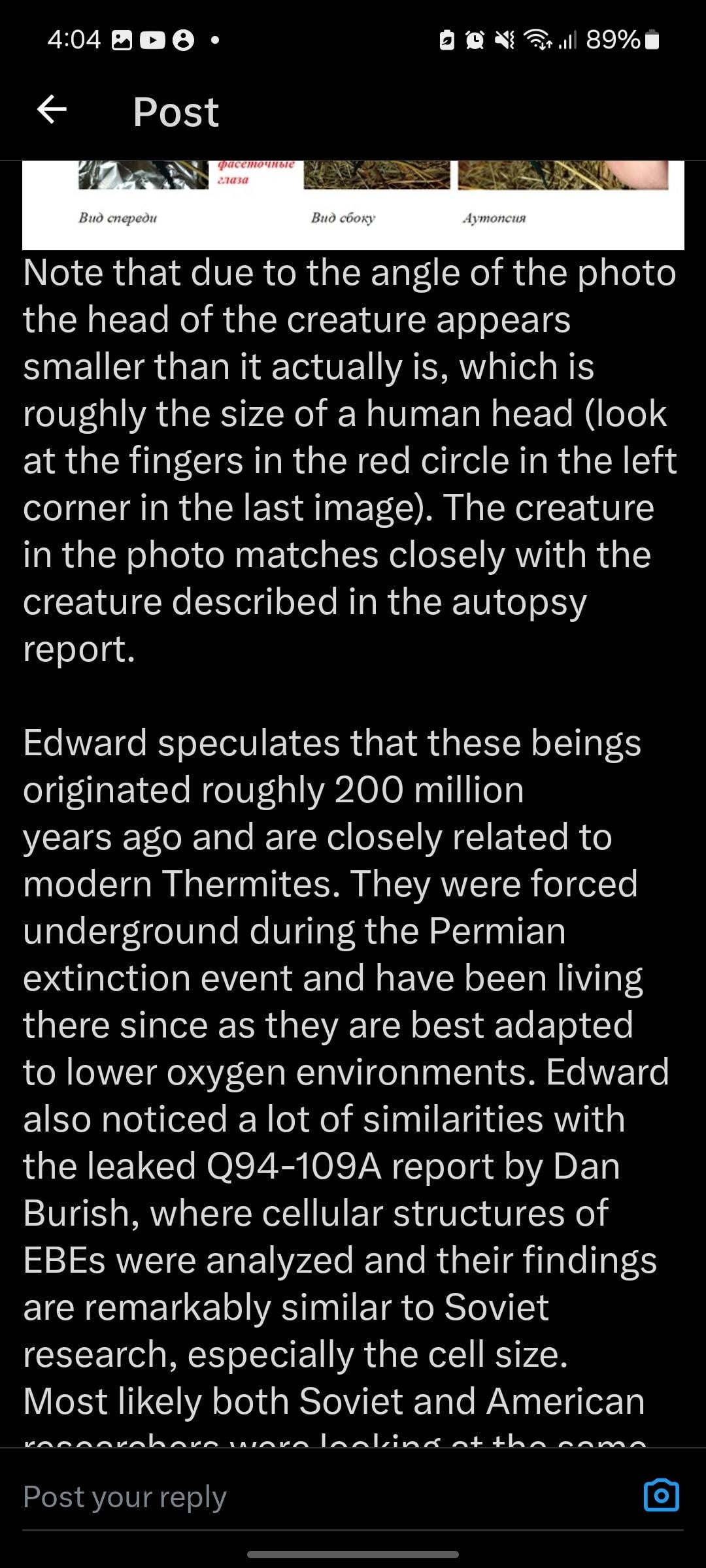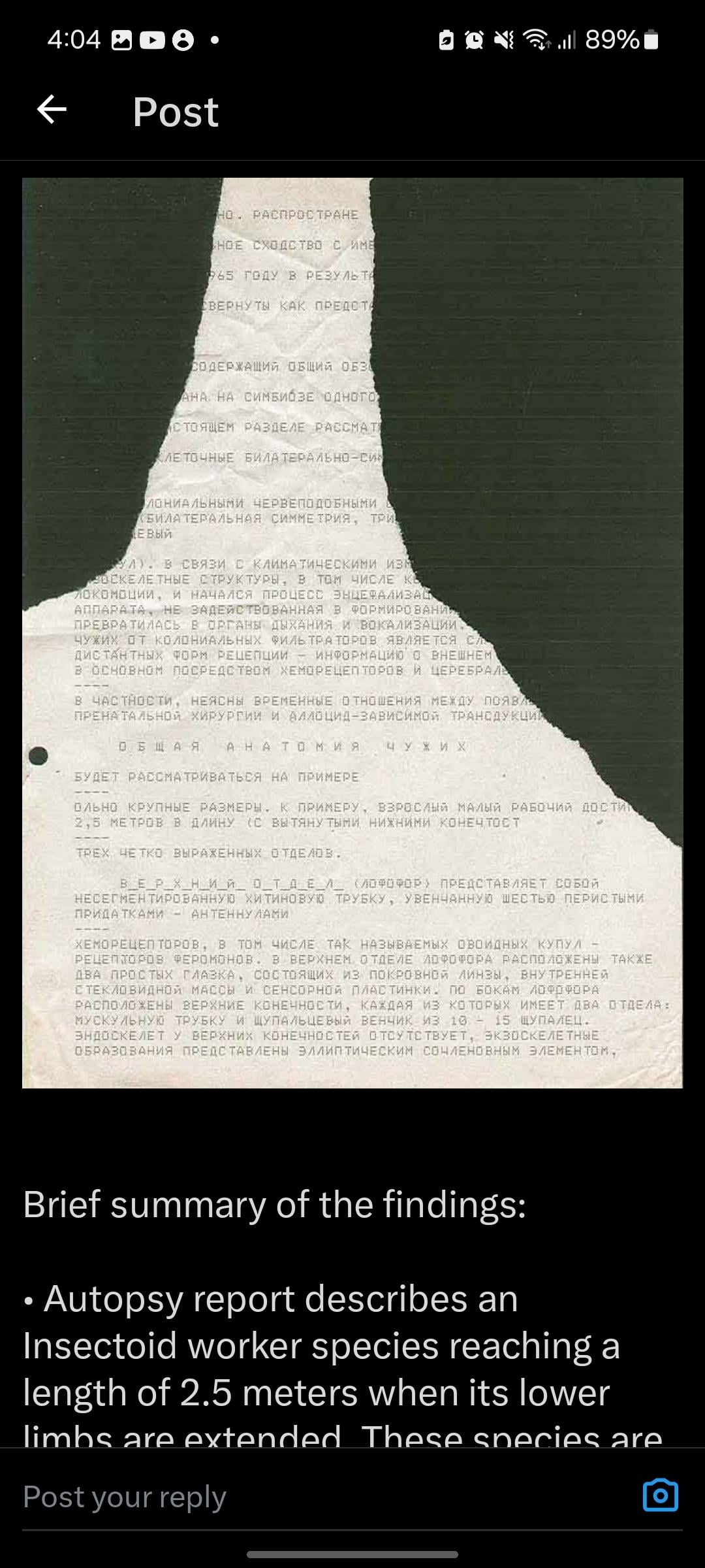 A leaked autopsy of an insectoid creature in the USSR from 1996? My ontological shock is registering as a one on Kardashev’s Rotten Tomatoes scale. Maybe a one-point-two. Thanks for sharing this.