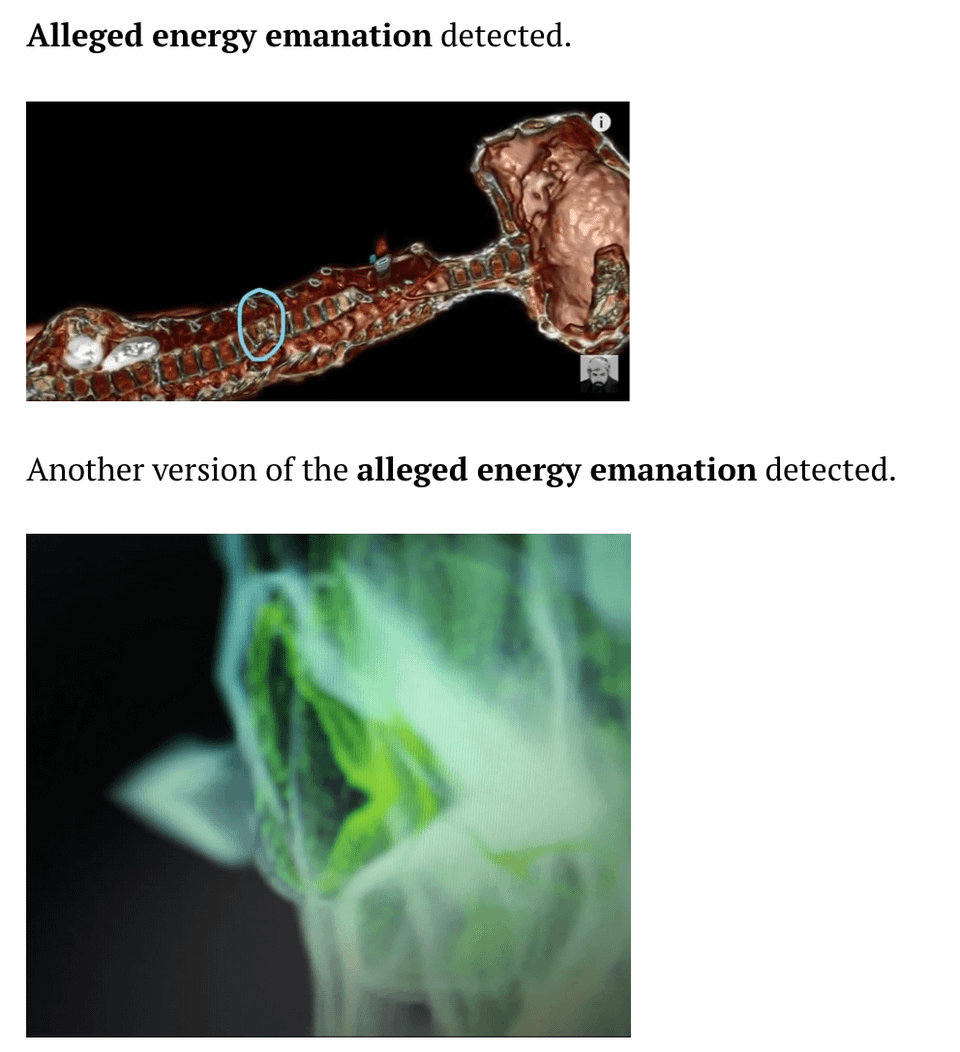 * Reddish “flame” over metal implant seems to suggest some sort of “energy emanation.”