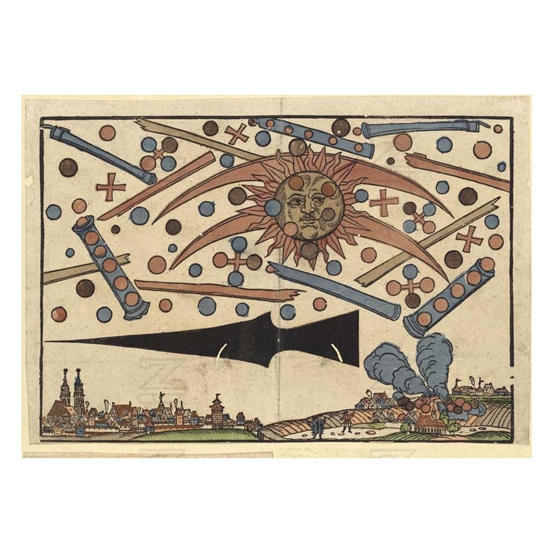 In the morning of April 14, 1561, at daybreak, between 4 and 5 a.m., a dreadful apparition occurred on the sun, and then this was seen in Nuremberg in the city, before the gates and in the country – by many men and women. At first there appeared in the middle of the sun two blood-red semi-circular arcs, just like the moon in its last quarter. And in the sun, above and below and on both sides, the color was blood, there stood a round ball of partly dull, partly black ferrous color. Likewise there stood on both sides and as a torus about the sun such blood-red ones and other balls in large number, about three in a line and four in a square, also some alone. In between these globes there were visible a few blood-red crosses, between which there were blood-red strips, becoming thicker to the rear and in the front malleable like the rods of reed-grass, which were intermingled, among them two big rods, one on the right, the other to the left, and within the small and big rods there were three, also four and more globes. These all started to fight among themselves, so that the globes, which were first in the sun, flew out to the ones standing on both sides, thereafter, the globes standing outside the sun, in the small and large rods, flew into the sun. Besides the globes flew back and forth among themselves and fought vehemently with each other for over an hour. And when the conflict in and again out of the sun was most intense, they became fatigued to such an extent that they all, as said above, fell from the sun down upon the earth 'as if they all burned' and they then wasted away on the earth with immense smoke. After all this there was something like a black spear, very long and thick, sighted; the shaft pointed to the east, the point pointed west. Whatever such signs mean, God alone knows. Although we have seen, shortly one after another, many kinds of signs on the heaven, which are sent to us by the almighty God, to bring us to repentance, we still are, unfortunately, so ungrateful that we despise such high signs and miracles of God. Or we speak of them with ridicule and discard them to the wind, in order that God may send us a frightening punishment on account of our ungratefulness. After all, the God-fearing will by no means discard these signs, but will take it to heart as a warning of their merciful Father in heaven, will mend their lives and faithfully beg God, that He may avert His wrath, including the well-deserved punishment, on us, so that we may temporarily here and perpetually there, live as his children. For it, may God grant us his help, Amen.